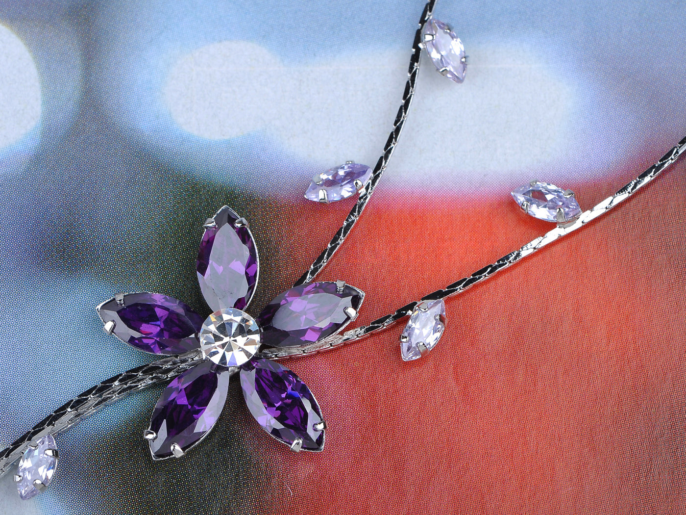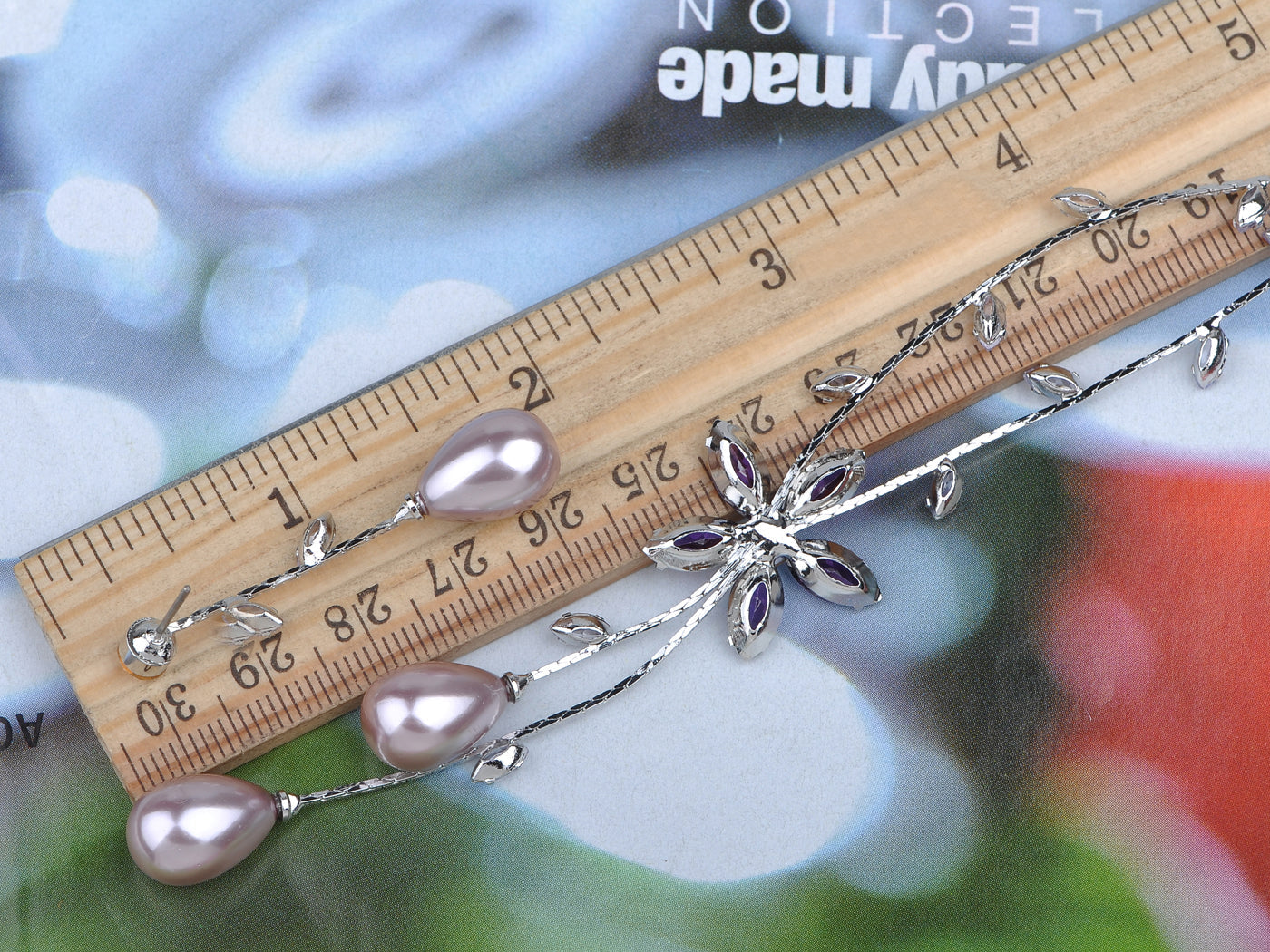 - LOVELY DESIGN - Silver chain necklace featuring a beautiful purple crystal rhinestone flower, clear crystal rhinestone leaves, and teardrop pearls at the bottom. Comes with matching earrings that contain clear crystal rhinestone leaves and a teardrop pearl at the bottom of each earring.