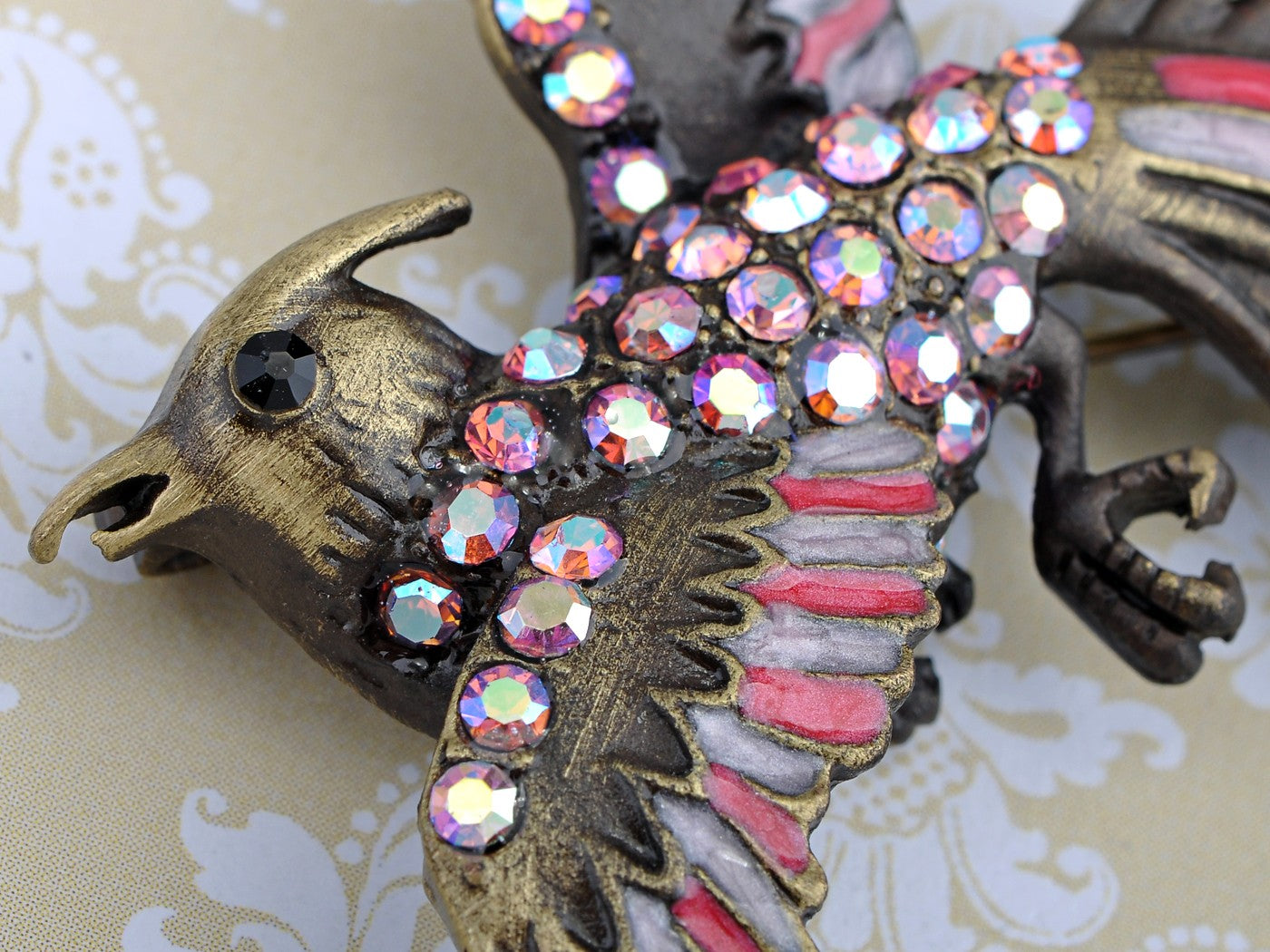- VIBRANT RED CRYSTALS AND PAINTED ENAMEL STYLE. Between the classic silver tone or the more vintage bronze accent, you can\'t go through with this beautiful brooch pin. With its arrangement of red crystals and pretty painted enamel to add a splash of color,