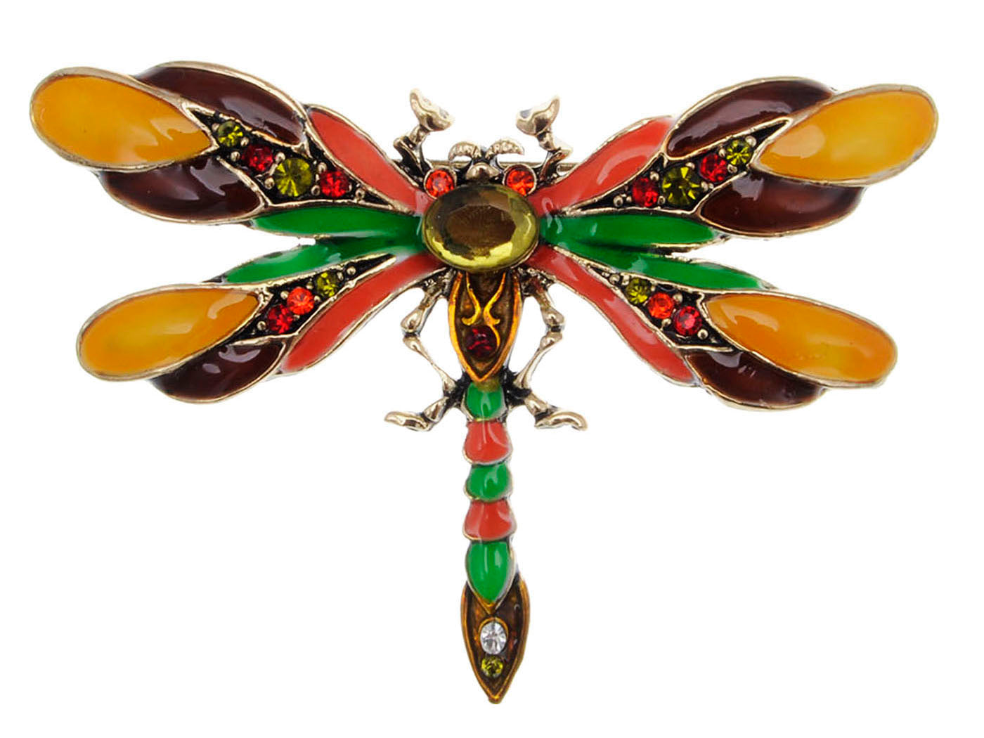 • UNIQUE DESIGN: Brooch with red, green, crystal colored rhinestones, multicolor painted enamel, and dragonfly design