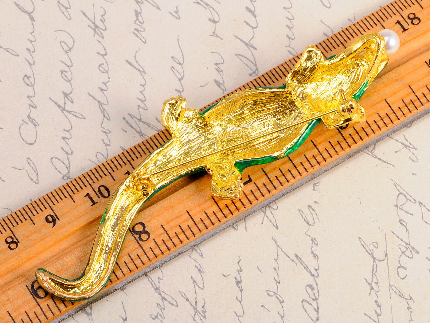 - RARE DESIGN - Make a statement with this emerald green alligator brooch! High detailed with green enamel with raised textured metal that creates the gators scales. Gold trim accents the feet and sparkly Swarovski pink rhinestones decorate the neck and eye