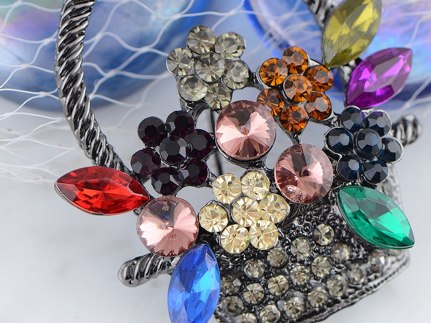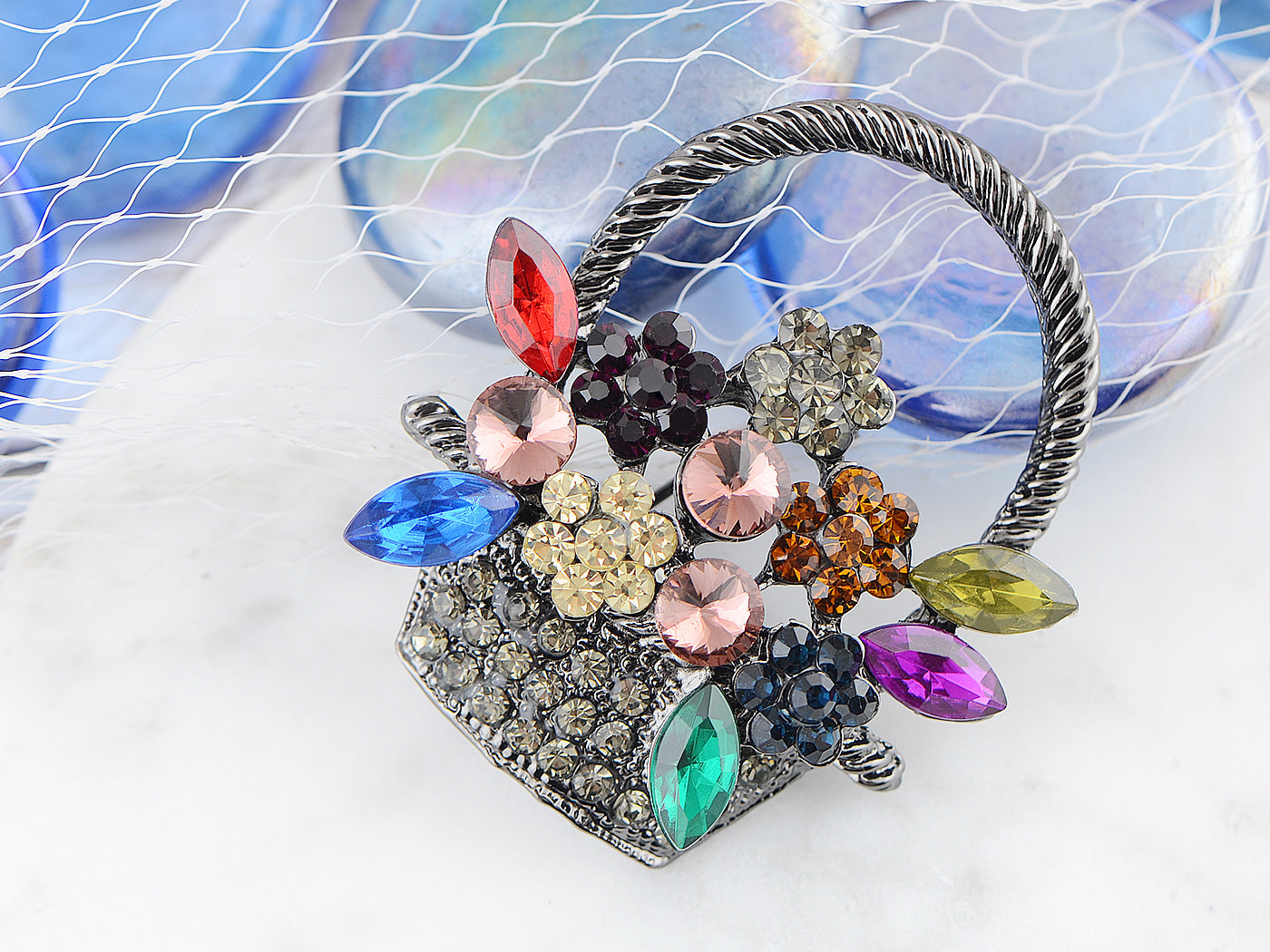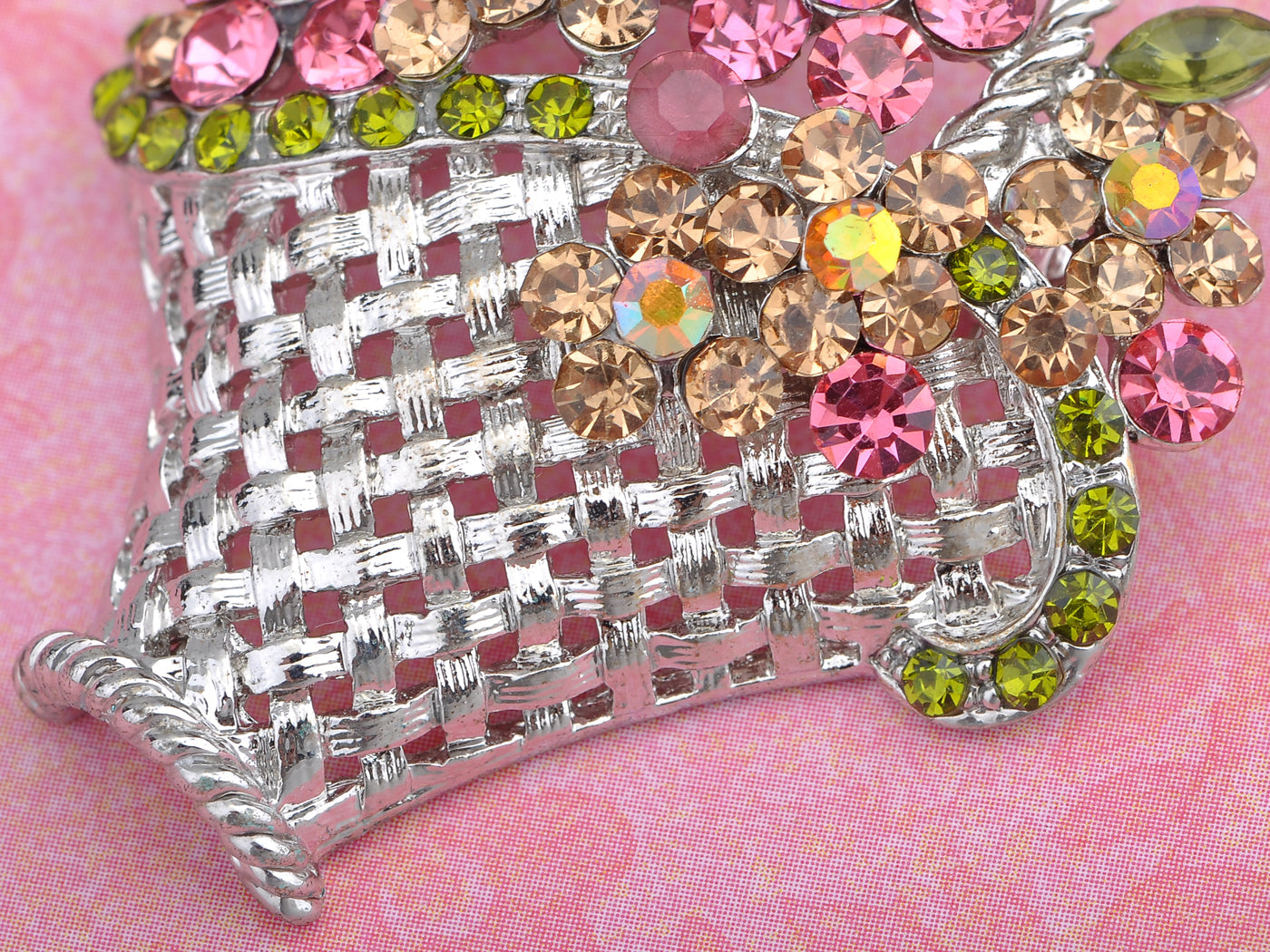- UNIQUE DESIGN - This brooch featuring floral basket design with sparkly pink/ topaz/ green/ blue multicolored crystal rhinestones, and silvery/gunmetal tone metal alloy base.