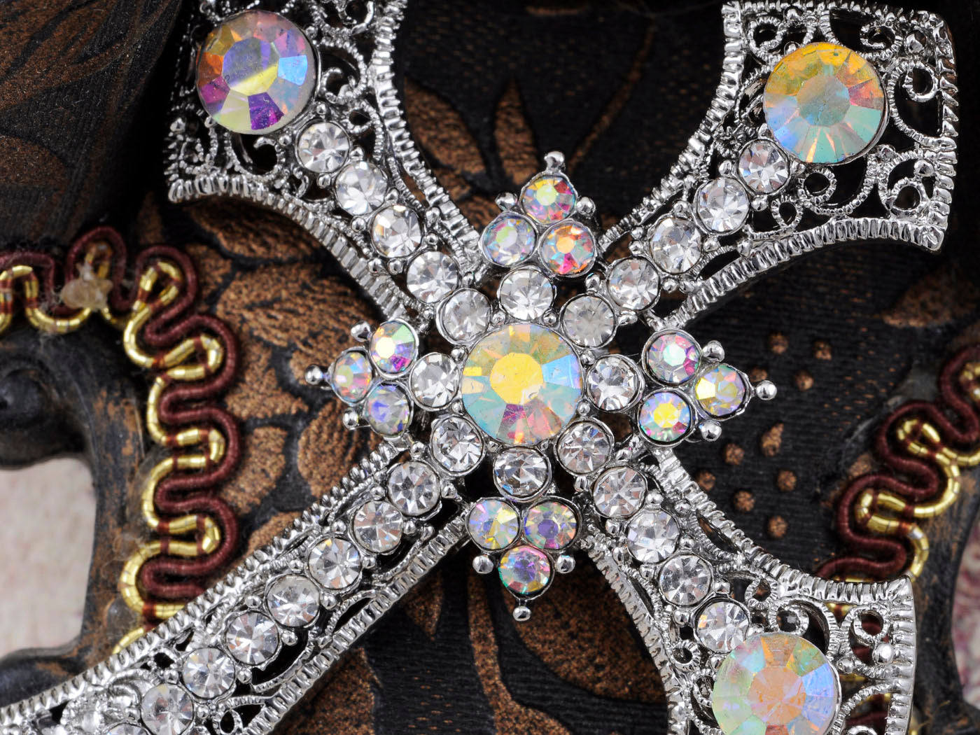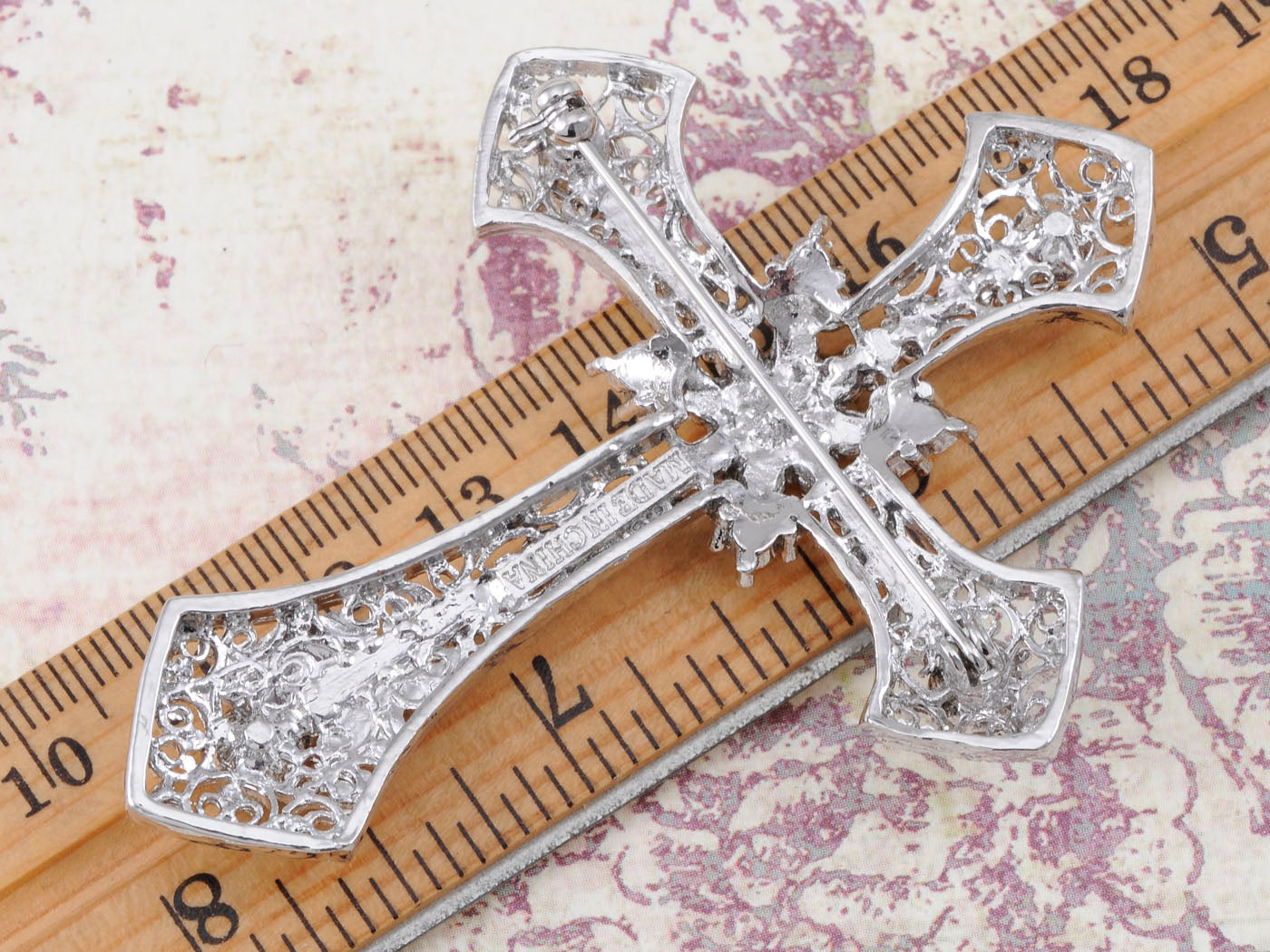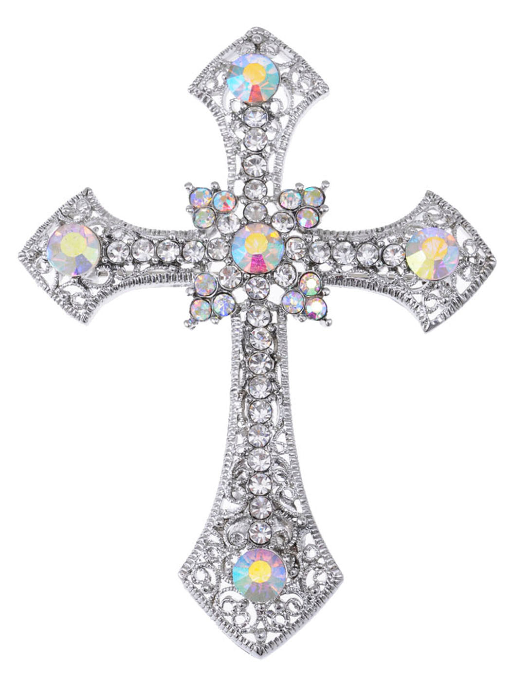 - BEJEWELED DESIGN - Add this brooch of an ornate flowery silver filigree cross with arrayed sparkling crystal rhinestones to your wardrobe! This holy Anglo Saxon cross pin is adorned with luminescent aurora borealis stones for some extra shimmer.