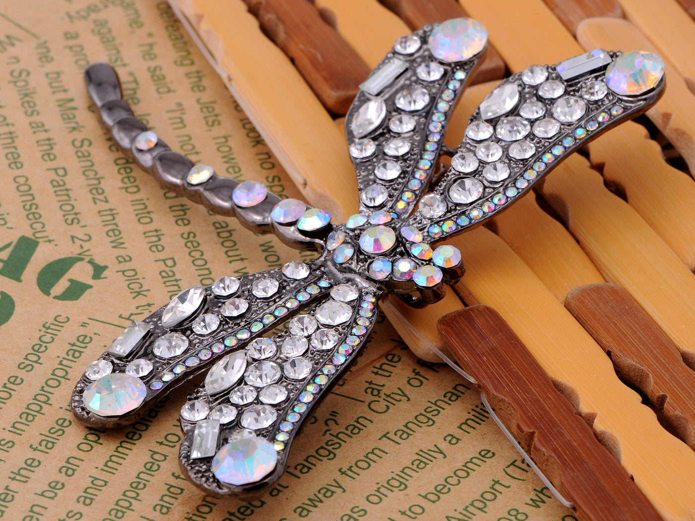 • UNIQUE DESIGN. Brooch featuring dragonfly design with shinely clear rainbow crystal rhinestones, and gunmetal tone metal alloy base.