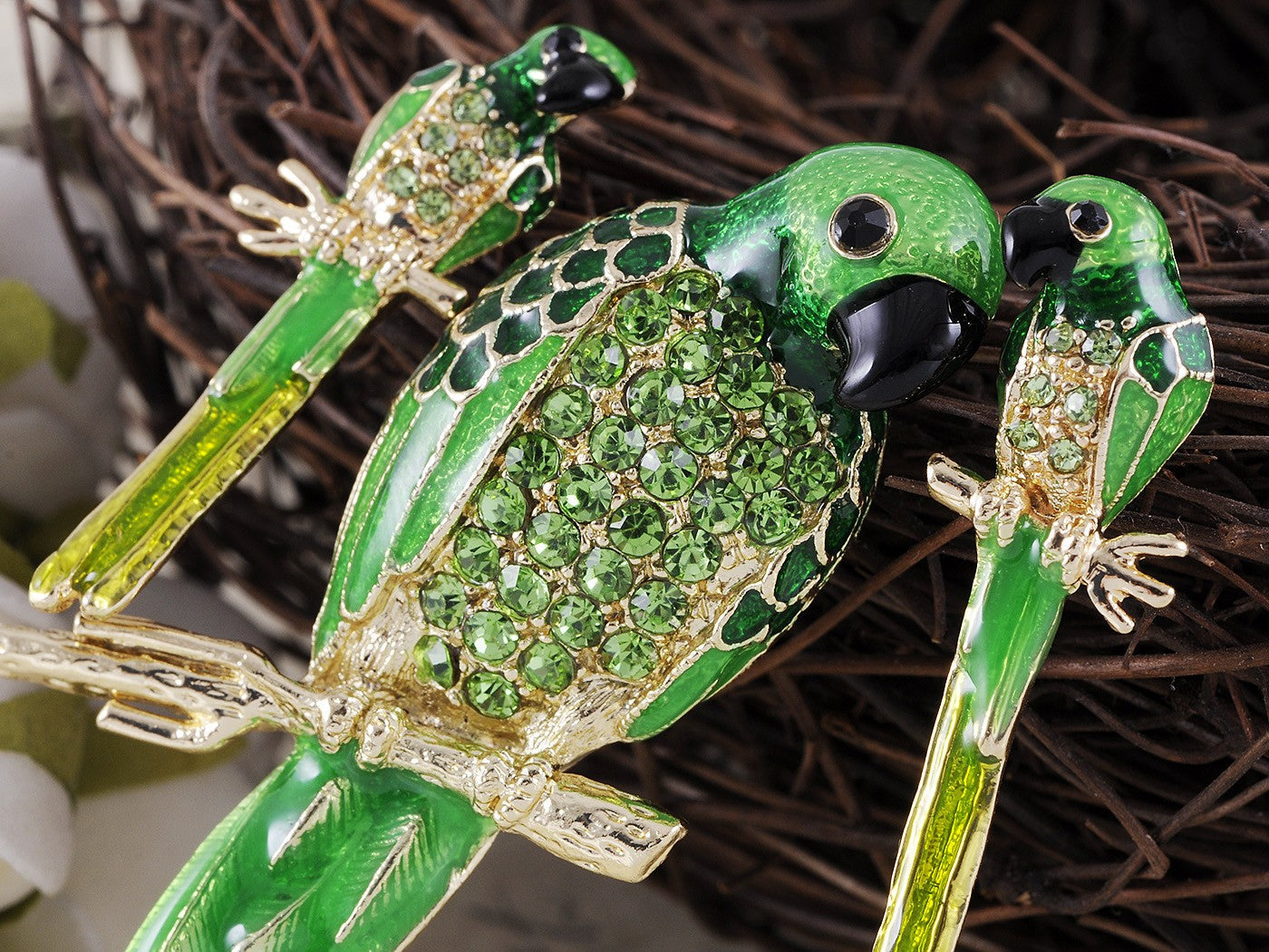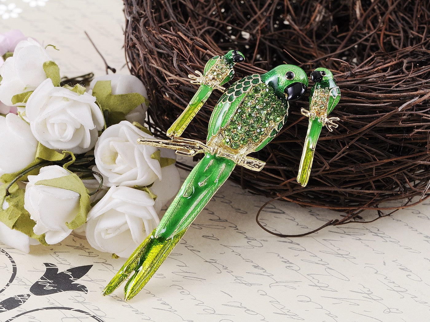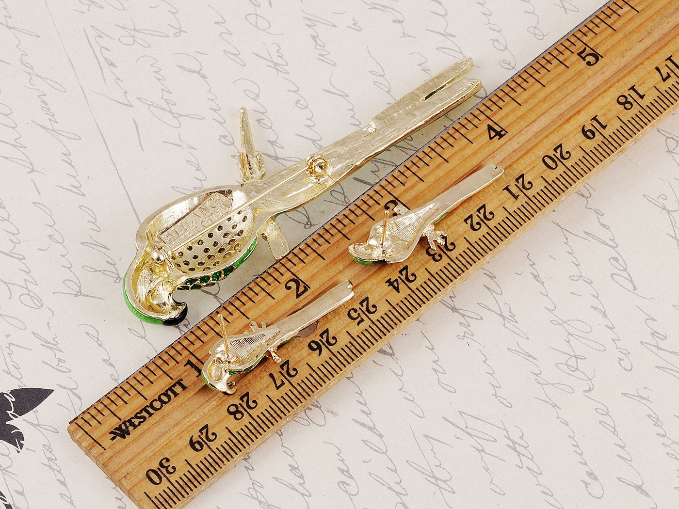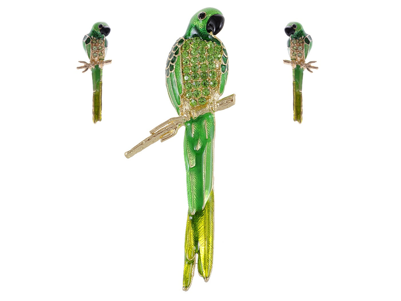 - UNIQUE DESIGN: Stud earrings and brooch set featuring parrot design with peridot colored rhinestones and painted glossy enamel.