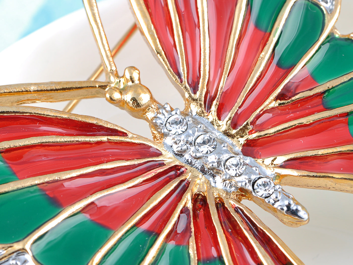 • We call this piece our fire and earth butterfly because it is painted in red and green enamel paint on its wings, The edges of the wings are adorned with Swarovski crystals.