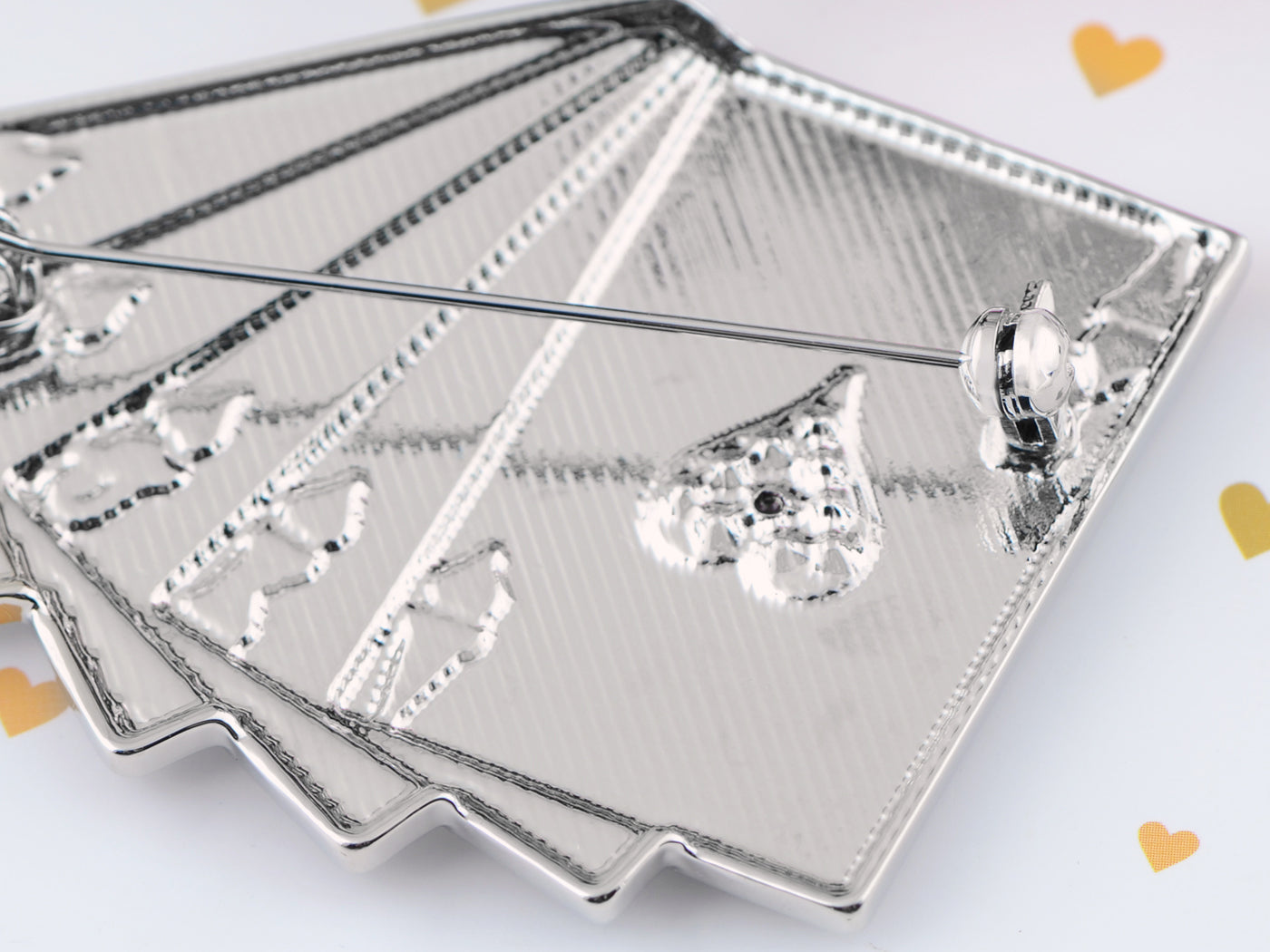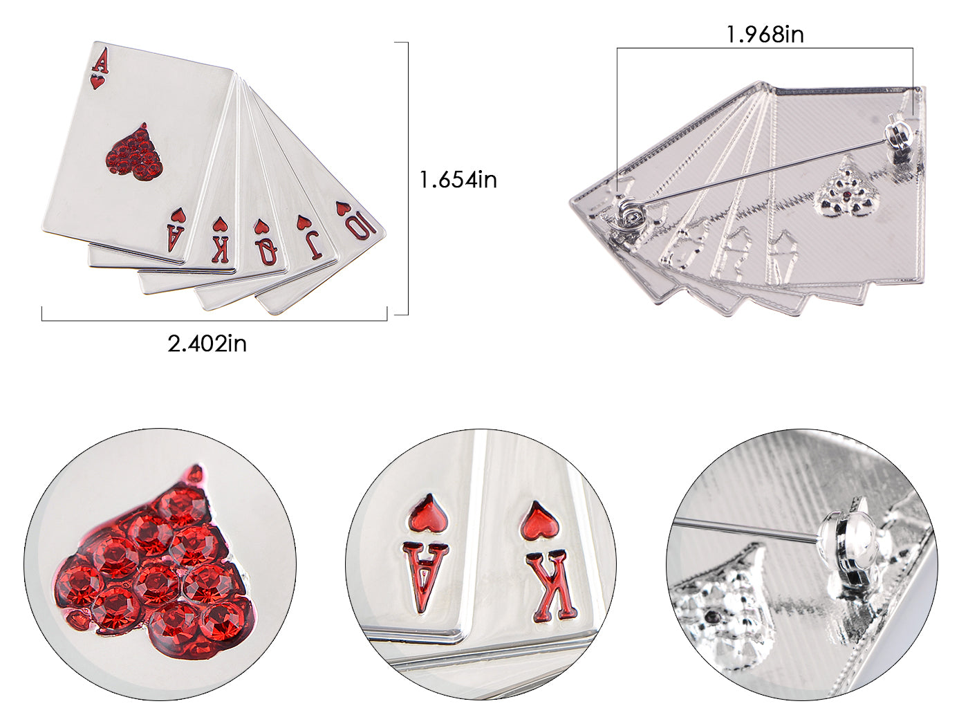 - WHIMSICAL DESIGN - Beautiful silver tone five cards brooch. Comes in a royal flush that has a white front with red lettering and red crystal rhinestones for the heart symbol.