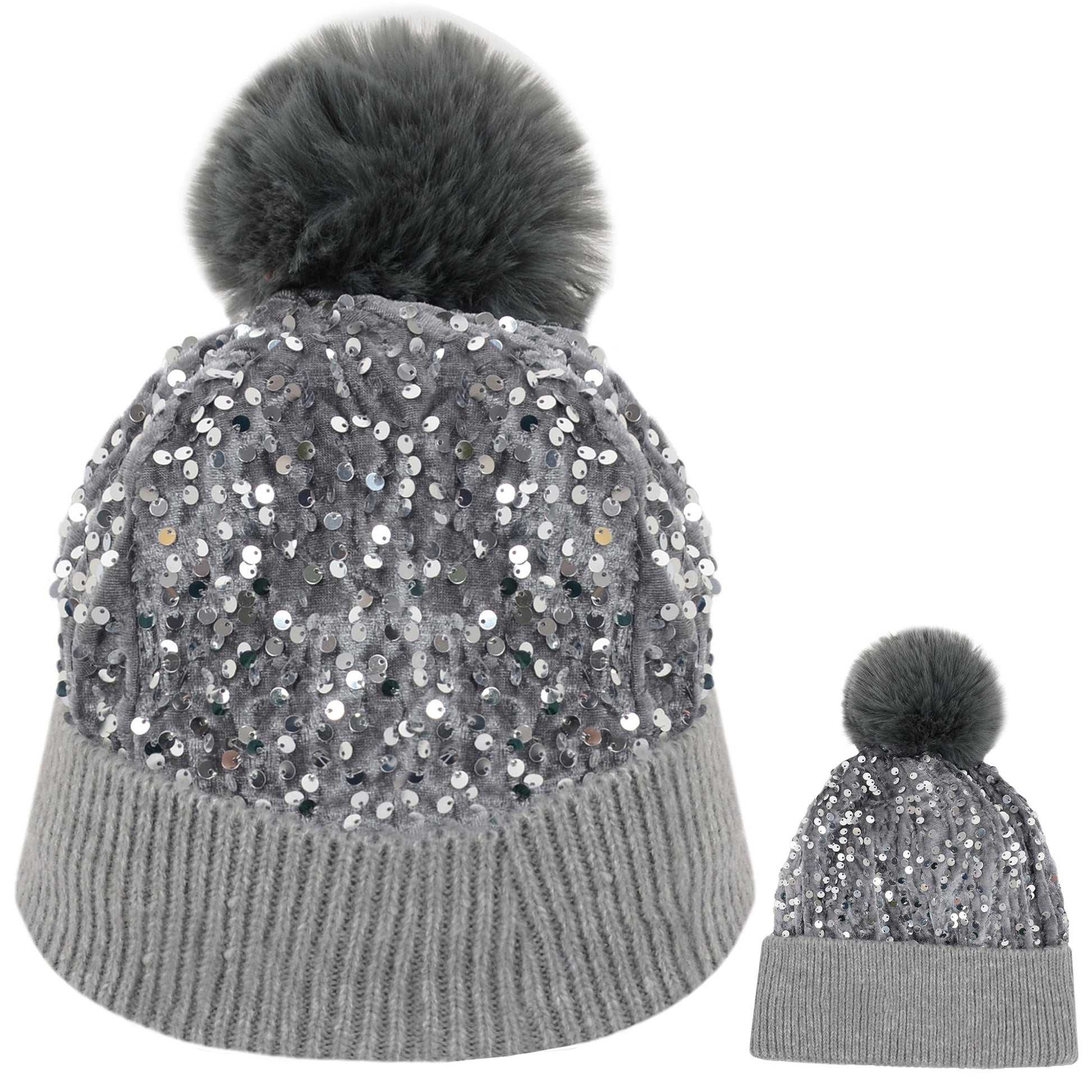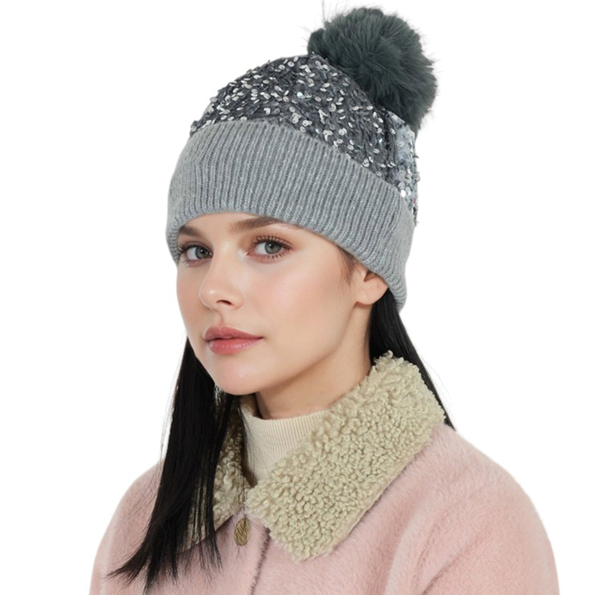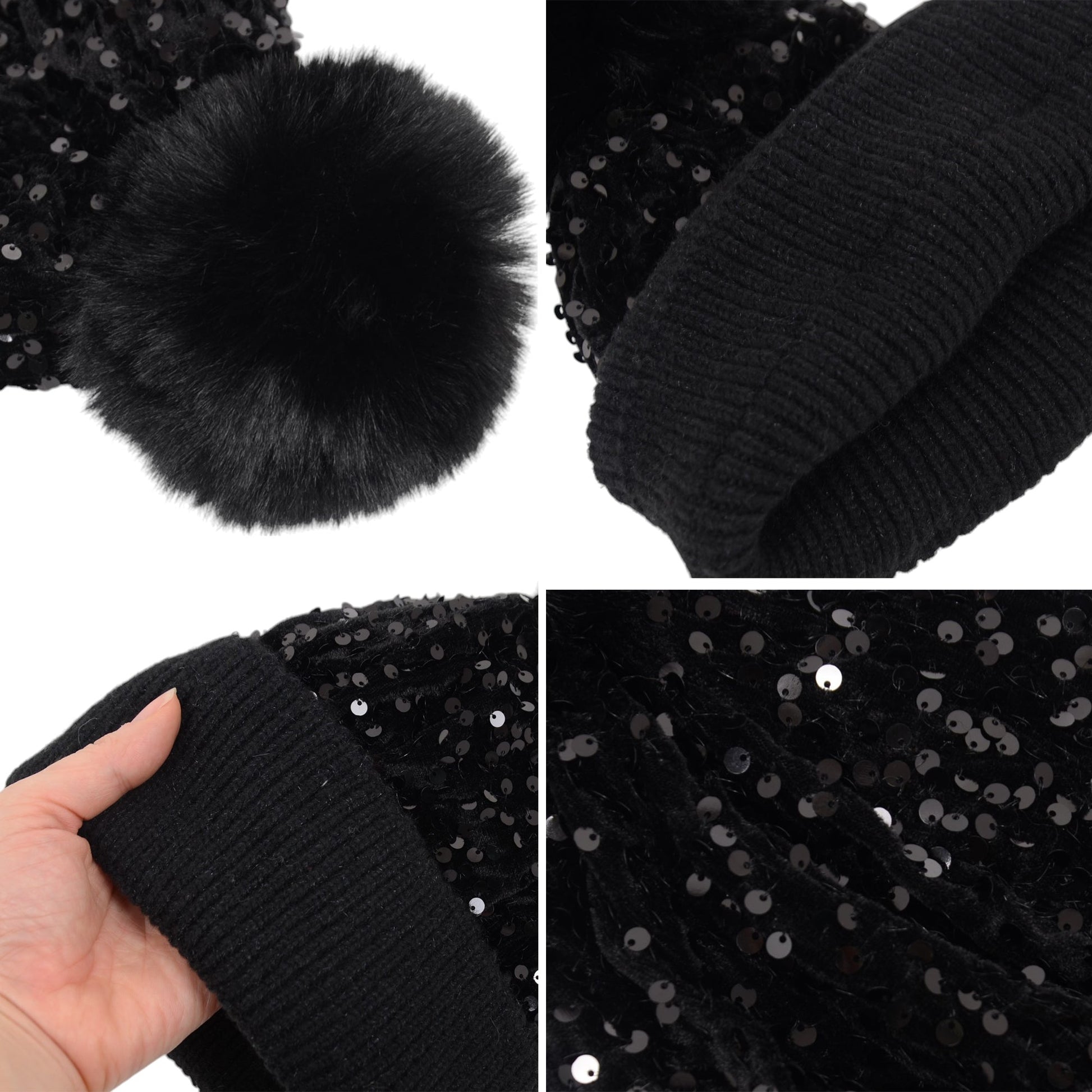 Sparkly Sequin Beanie Hat with Faux Fur Pom Pom Knit Skull Cap for Women