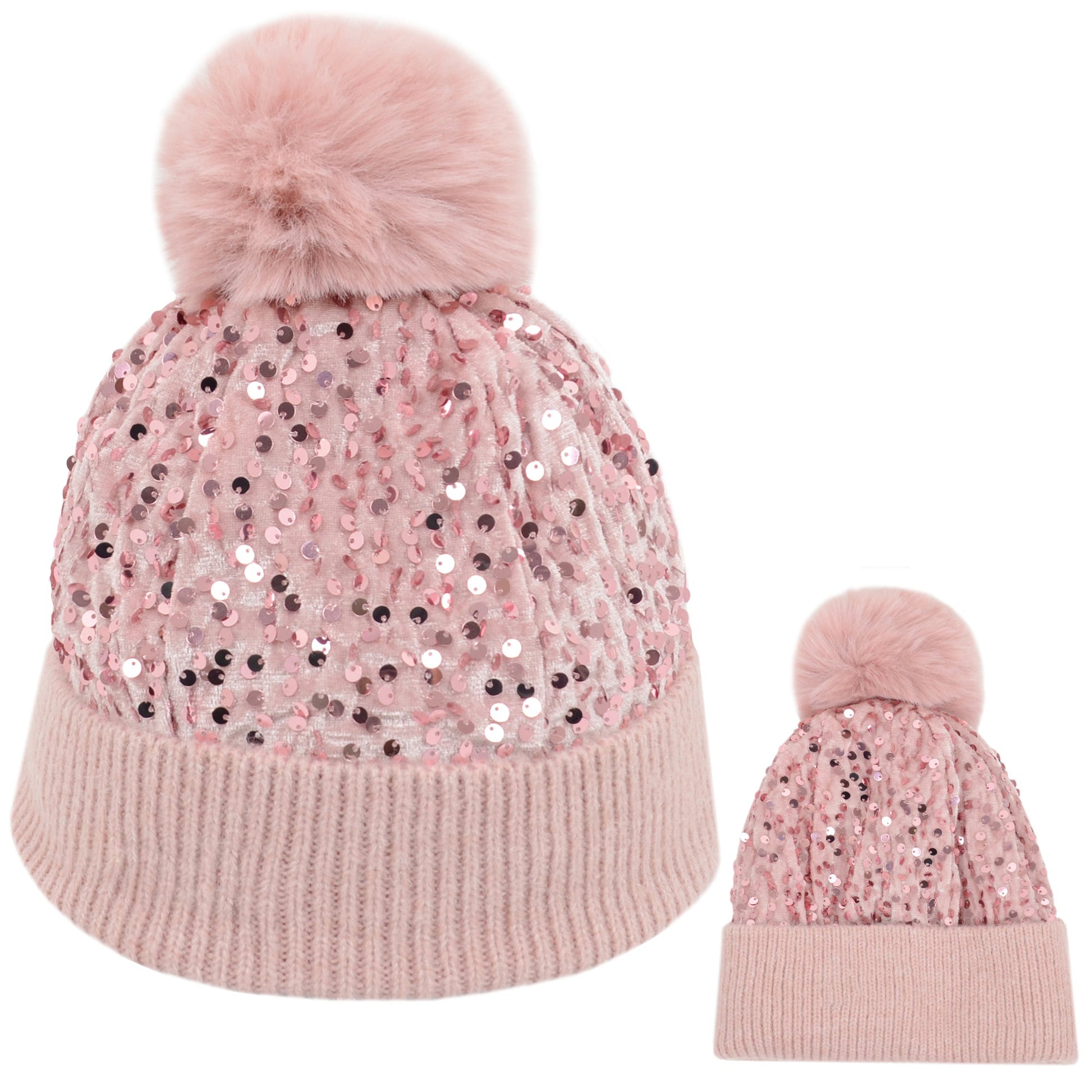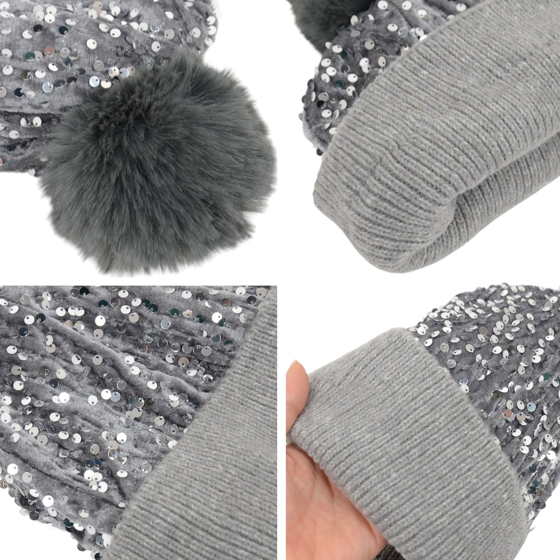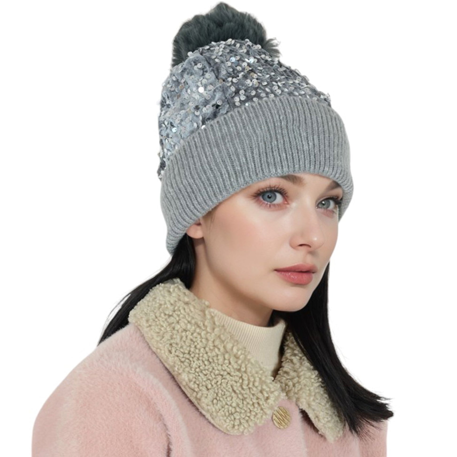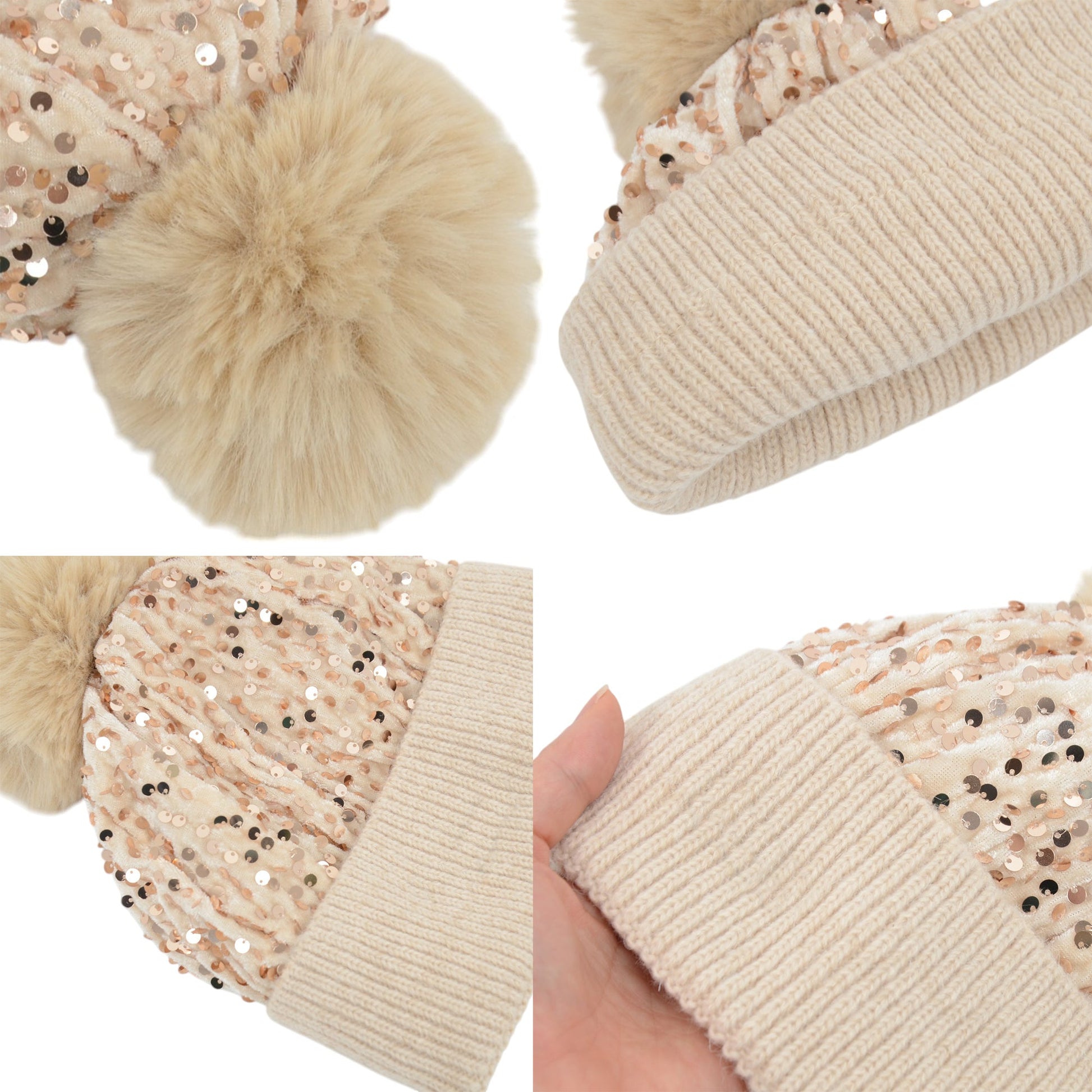 Sparkly Sequin Beanie Hat with Faux Fur Pom Pom Knit Skull Cap for Women