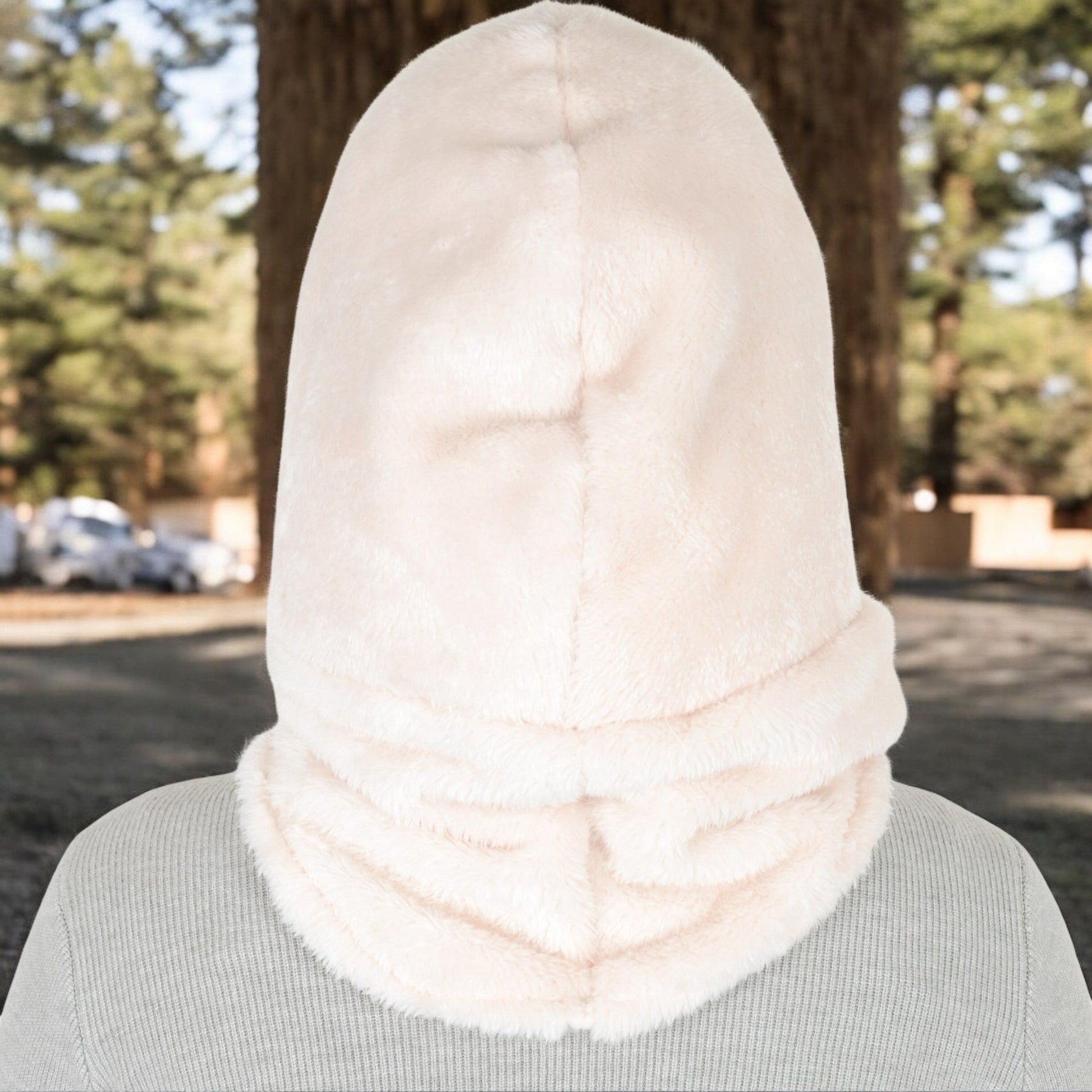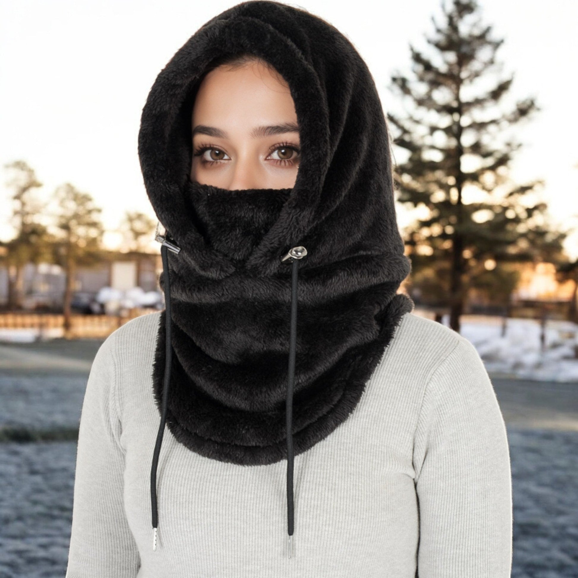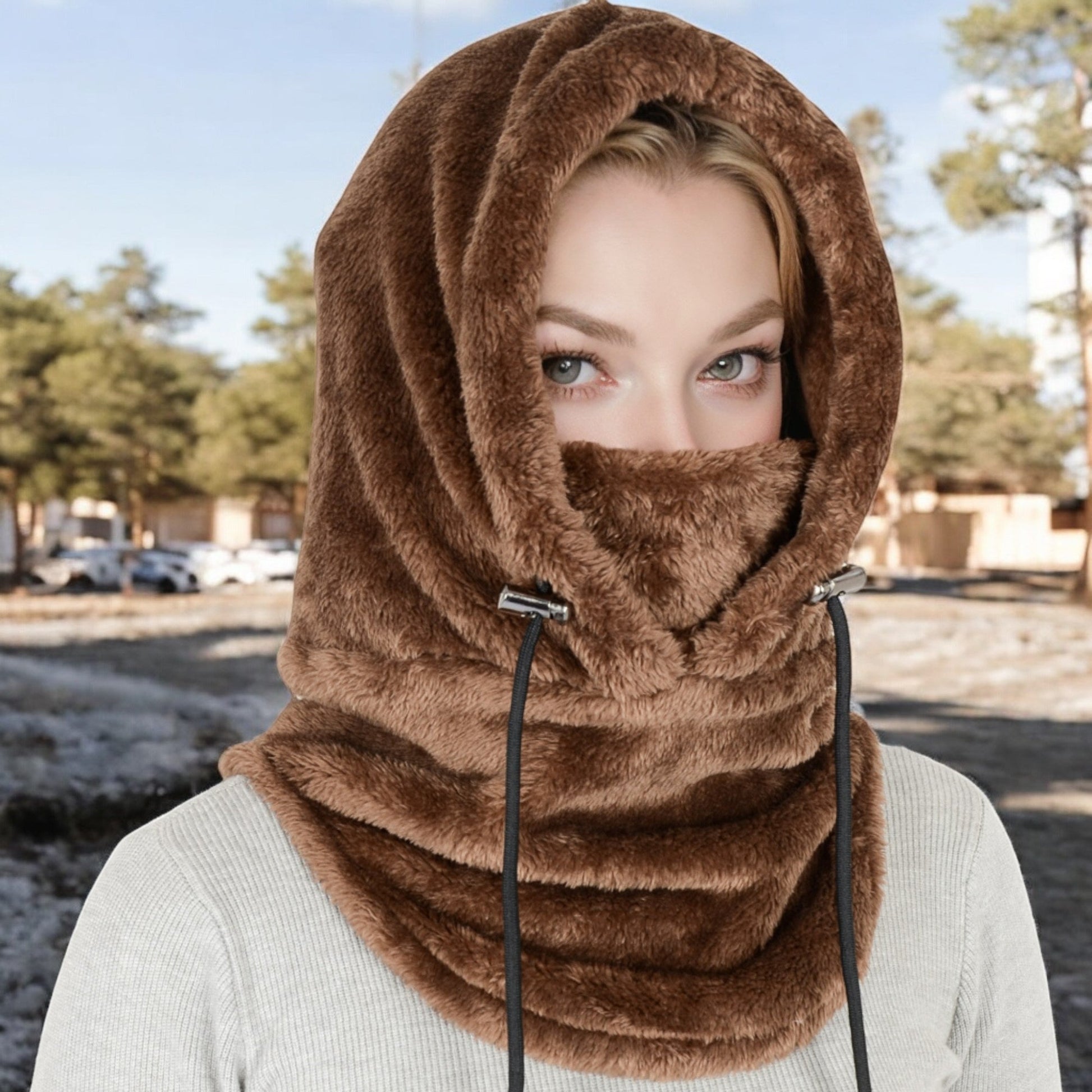 Faux Shearling Hooded Scarf with Adjustable Drawstrings and Extended Neck Coverage