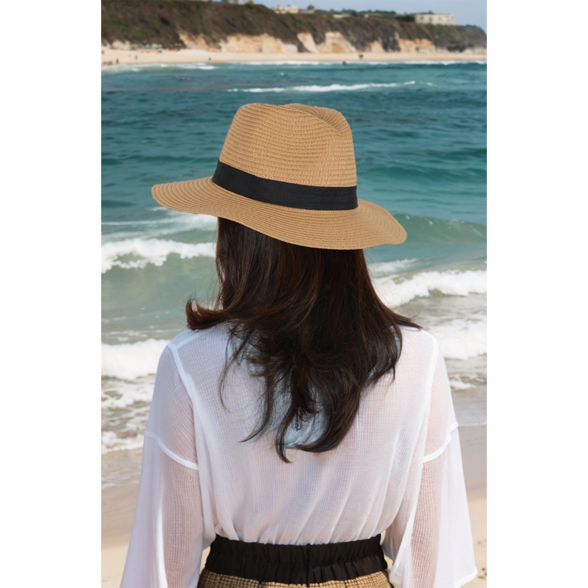 Wide Brim Straw Fedora Sun Hat with Black Band Lightweight Packable Summer Panama Hat for UV Protection