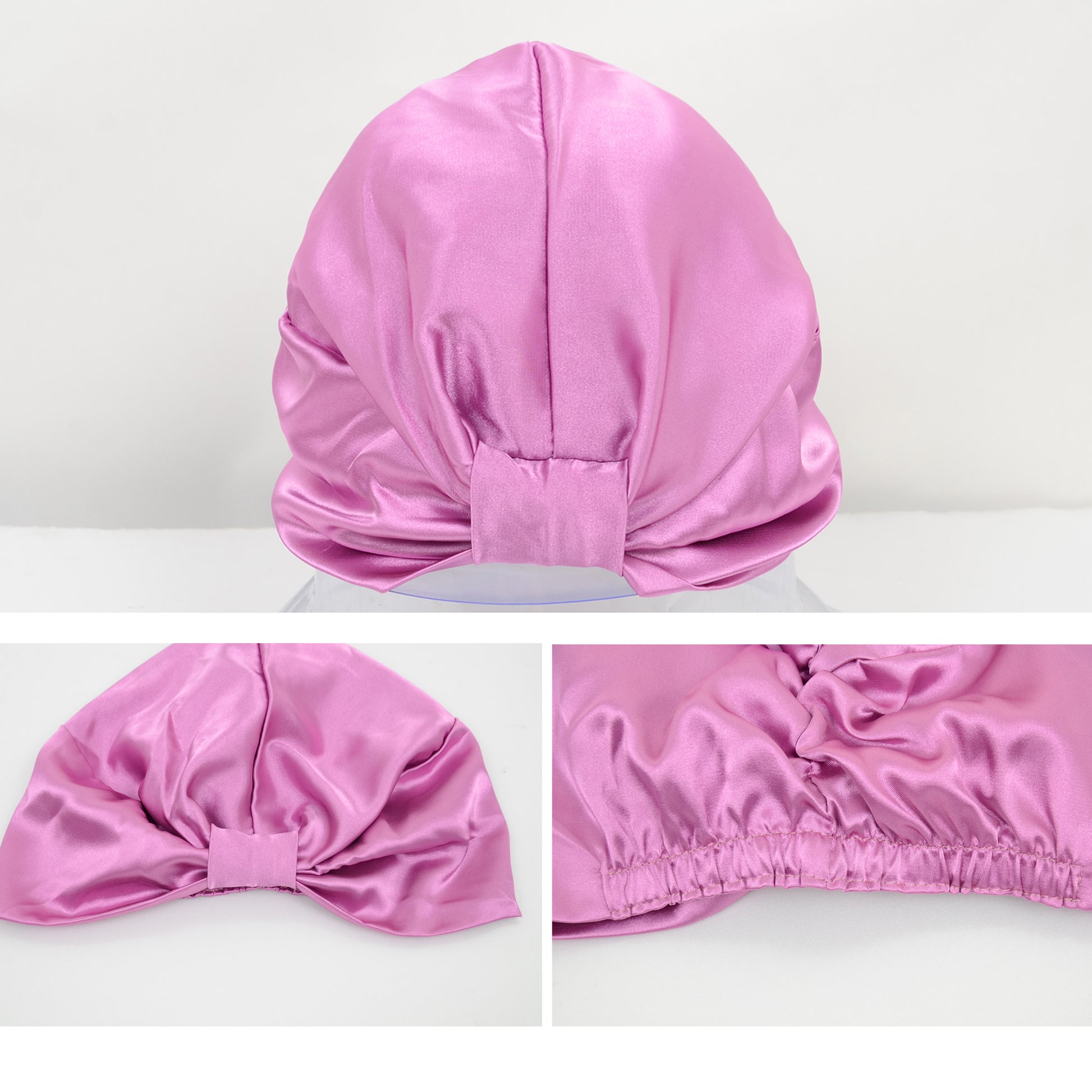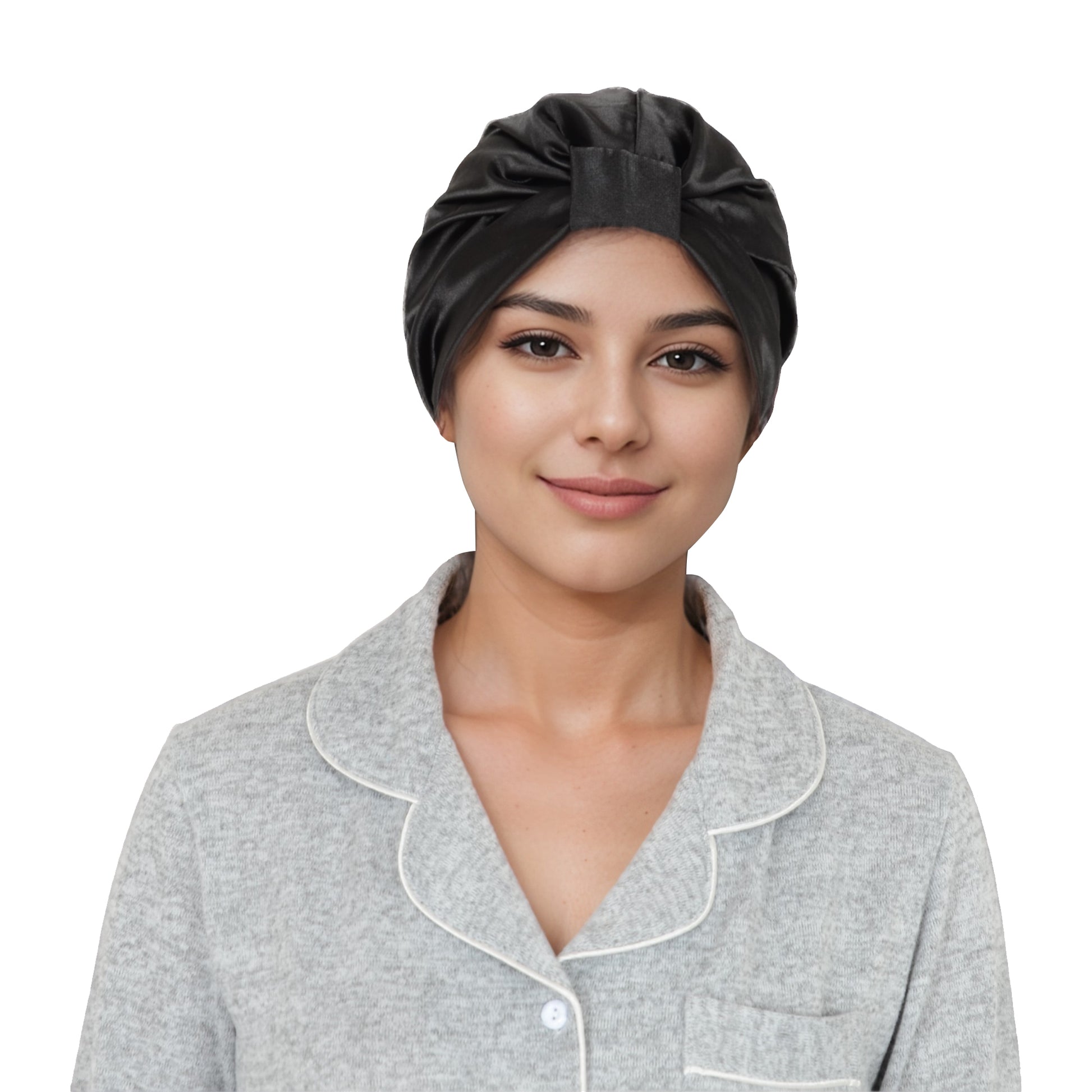 This satin turban cap features a smooth, glossy finish and a stylish front knot design that adds a chic touch to your look. The built-in elastic band at the back ensures a snug and secure fit for all head sizes. Made with soft satin fabric, it helps protect hair from breakage and frizz while maintaining moisture. Perfect for bedtime, lounging, or as a fashionable accessory throughout the day.