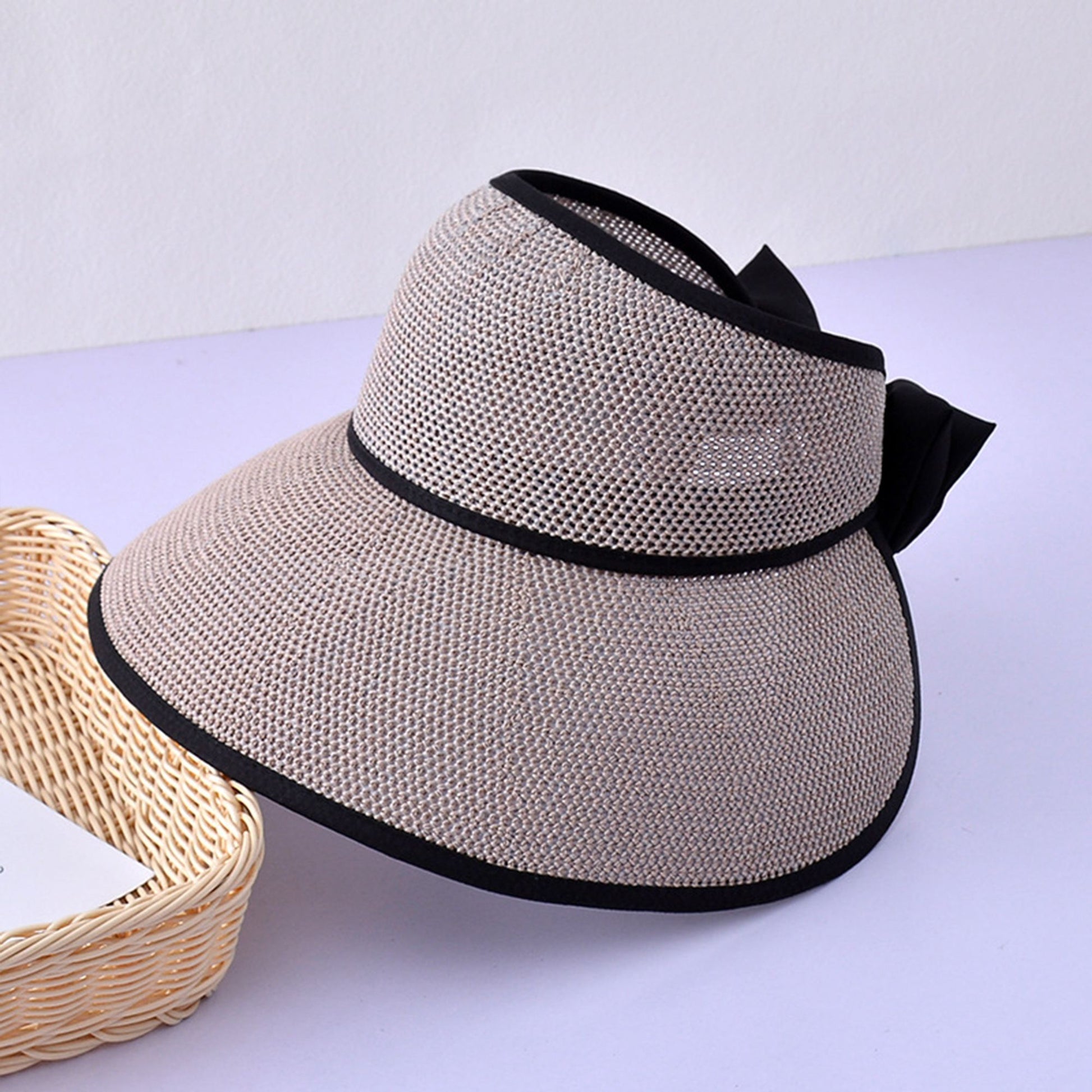 Womens Roll Up Straw Sun Visor Wide Brim Bow Detail Adjustable UV Protection Packable Summer Hat