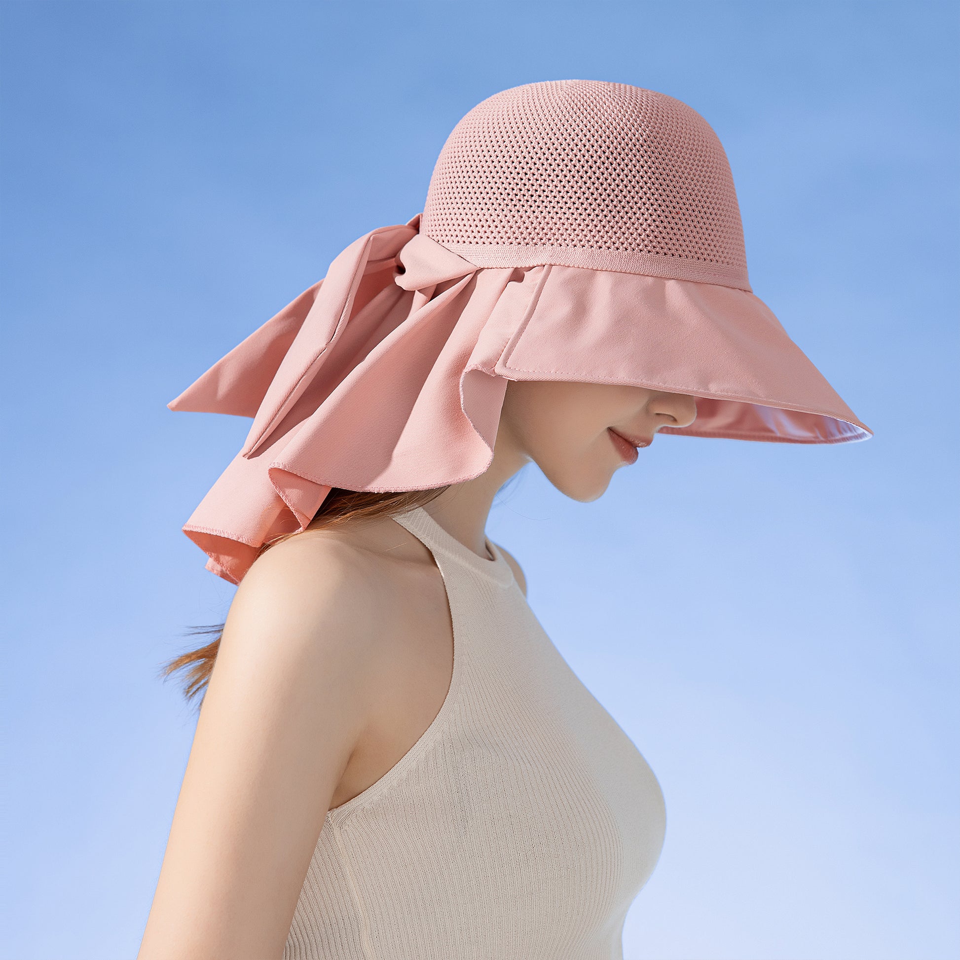 This women's mesh panel sun hat features a breathable top design, wide brim, and extended back flap for full UV protection. The elegant tie detail at the back adds charm while ensuring a secure fit. Perfect for travel, beach outings, or garden walks.