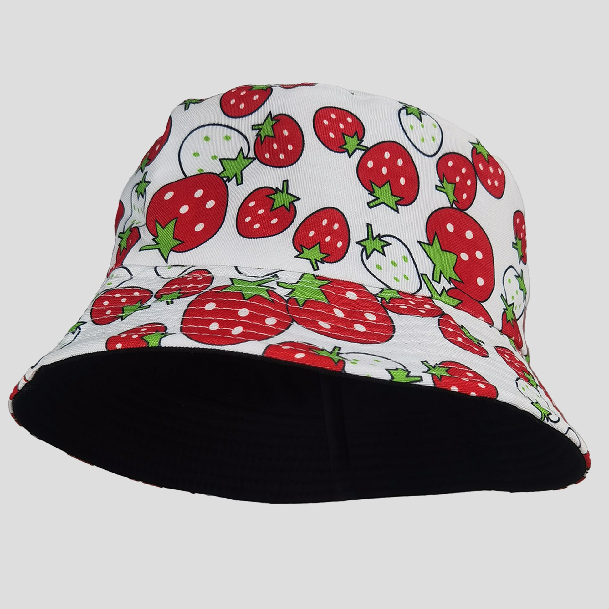 This red strawberry - Print Bucket Hat is a fashionable and functional accessory that's sure to turn heads. The hat showcases a bold and colorful banana print against a sleek black backdrop, instantly infusing a tropical and playful spirit into your look. Whether you're heading to the beach, going on a vacation, or just want to add a pop of fun to your daily attire, this hat fits the bill.