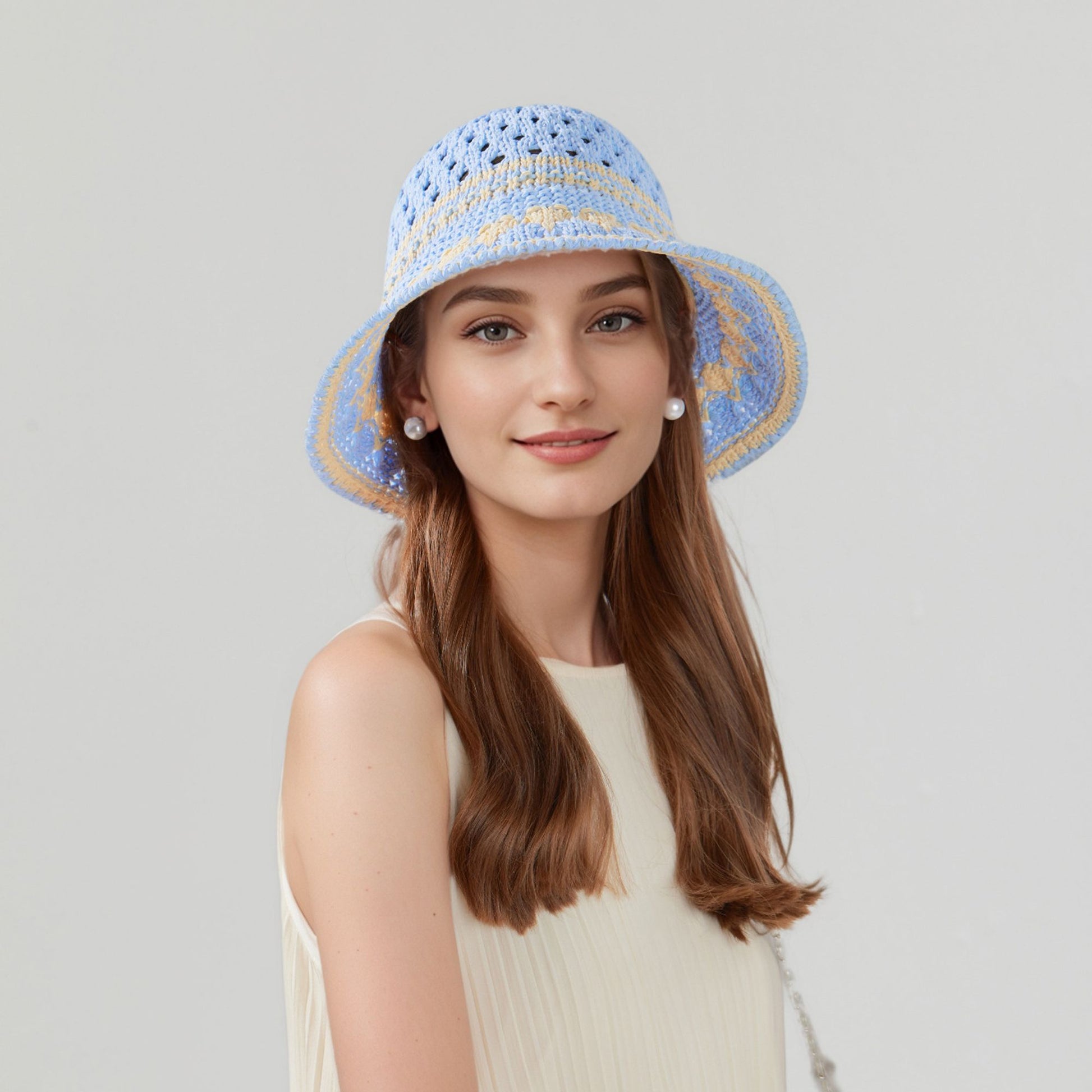 Crochet Knit Bucket Hat with Openwork Floral Pattern and Rolled Brim for Lightweight Summer Style