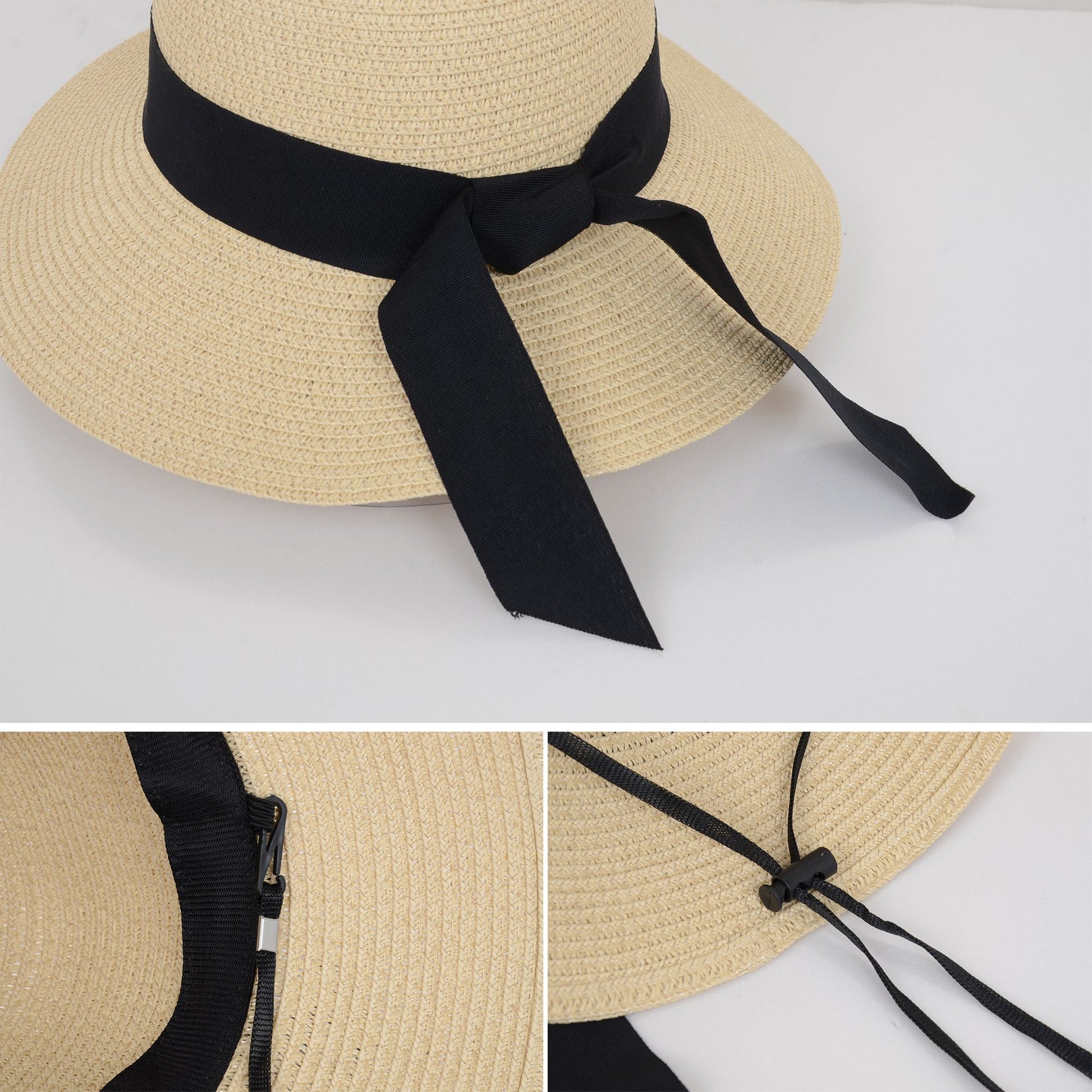 Wide Brim Straw Sun Hat with Black Ribbon Bow Adjustable Chin Strap Inner Sweatband for Outdoor and Travel Use