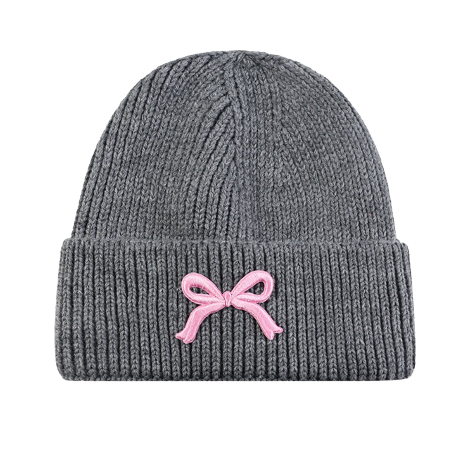 Ribbed Knit Beanie Hat with Folded Cuff and Embroidered Bow Detail