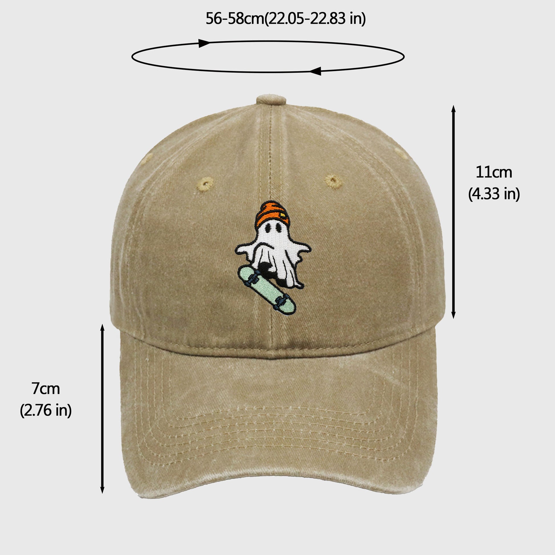 Add a dose of whimsy to your wardrobe with our Women's Beige Vintage Washed Baseball Cap featuring a skateboarding ghost embroidery. This cap combines a retro aesthetic with a fun design, thanks to its vintage washed finish that gives it a cool, worn - in appearance. The adorable embroidery of a ghost cruising on a skateboard brings a playful, lighthearted touch, making it a standout accessory.