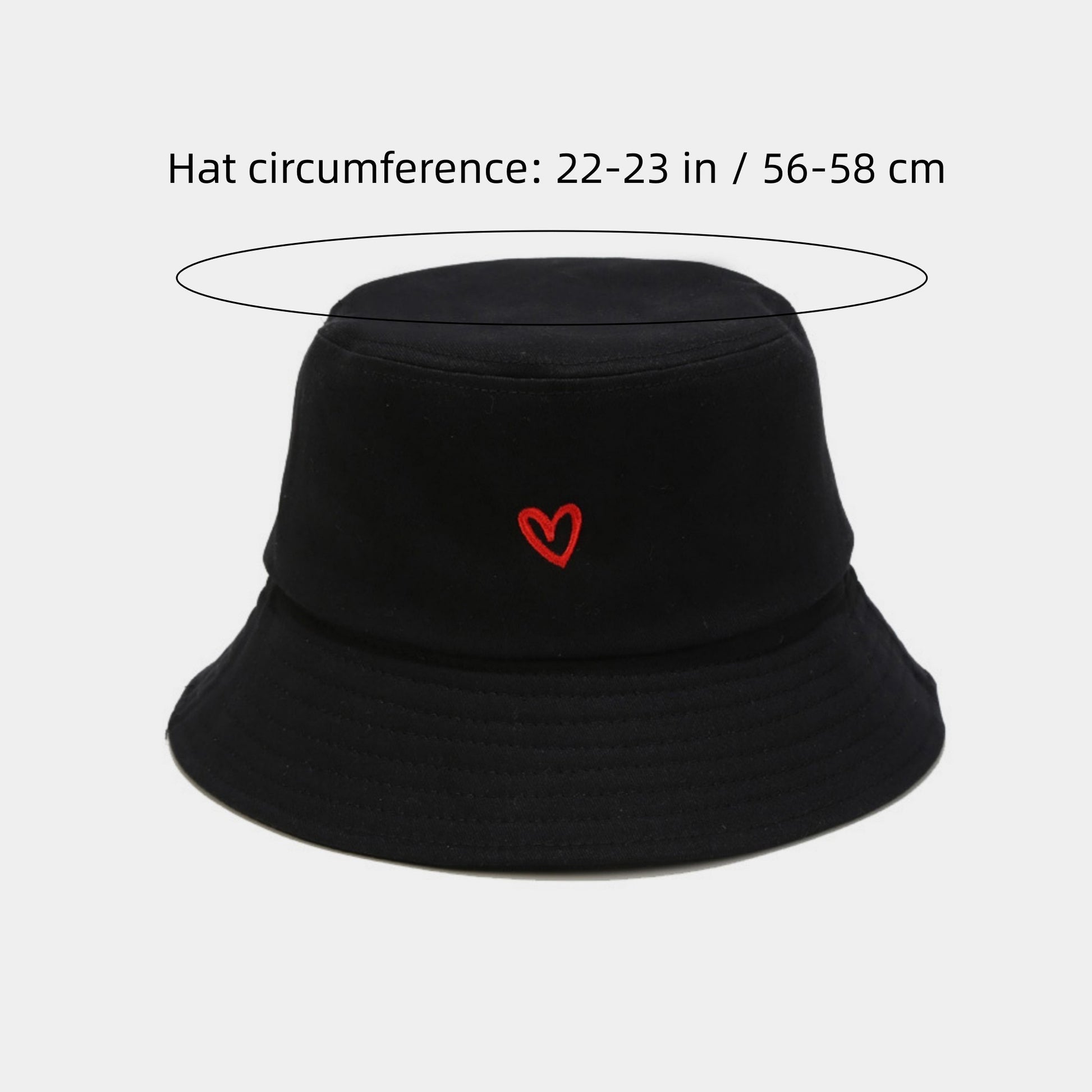 Cotton Bucket Hat with Red Heart Embroidery and Wide Brim
