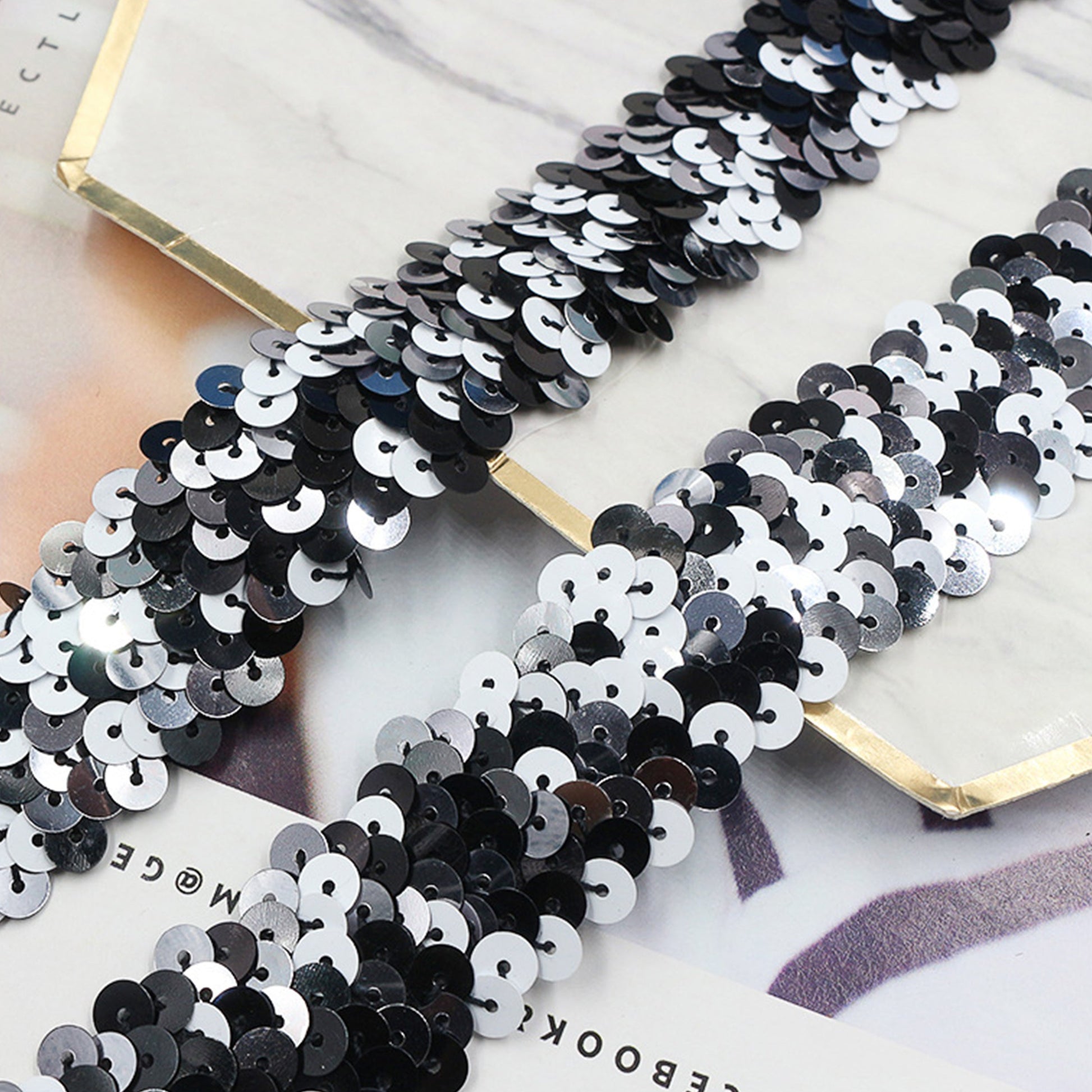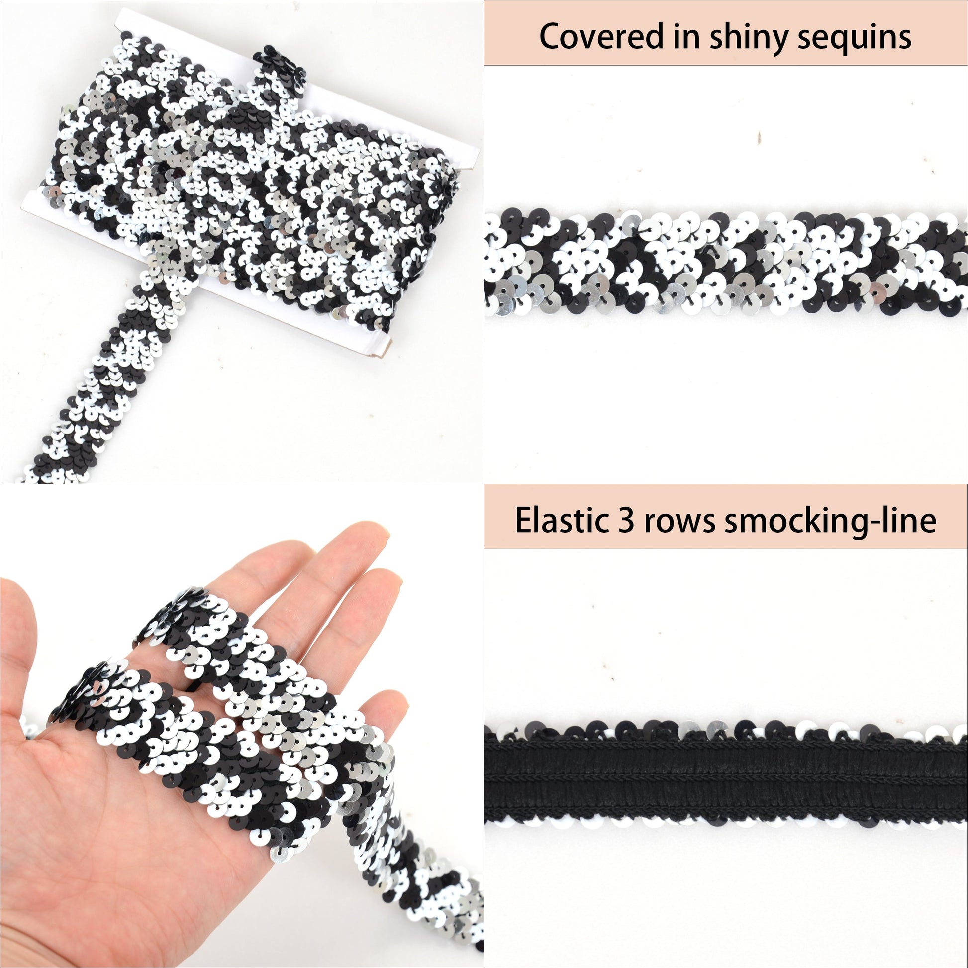 Covered in full shimmering sequins, this trim is designed to catch the light and create eye-catching effects. The stretch smocking band fabric provides both durability and flexibility, making it easy to incorporate into various DIY projects.Whether you're designing costumes for parties or creating festival decorations, this sequin trim is a versatile addition to your craft supplies. It can also be used for gift wrapping, adding an extra special touch to your presents. Additionally, it is great for scrapbooking and card making, allowing you to add a touch of elegance to your creations.Simply sew it onto your desired fabric or surface, and watch as your projects come to life with sparkle and shine. Elevate your sewing, crafting, and decorating with this beautiful and versatile trim.