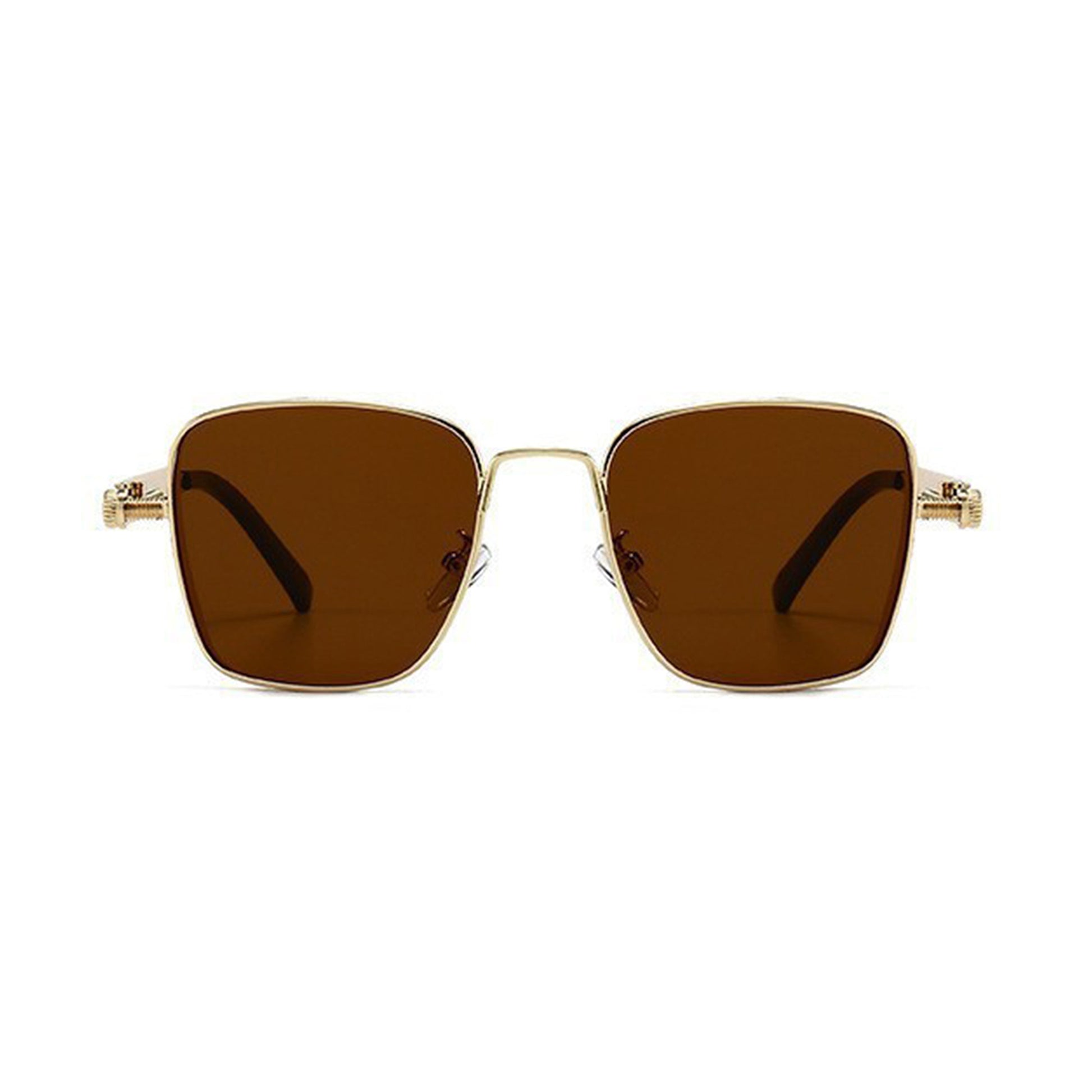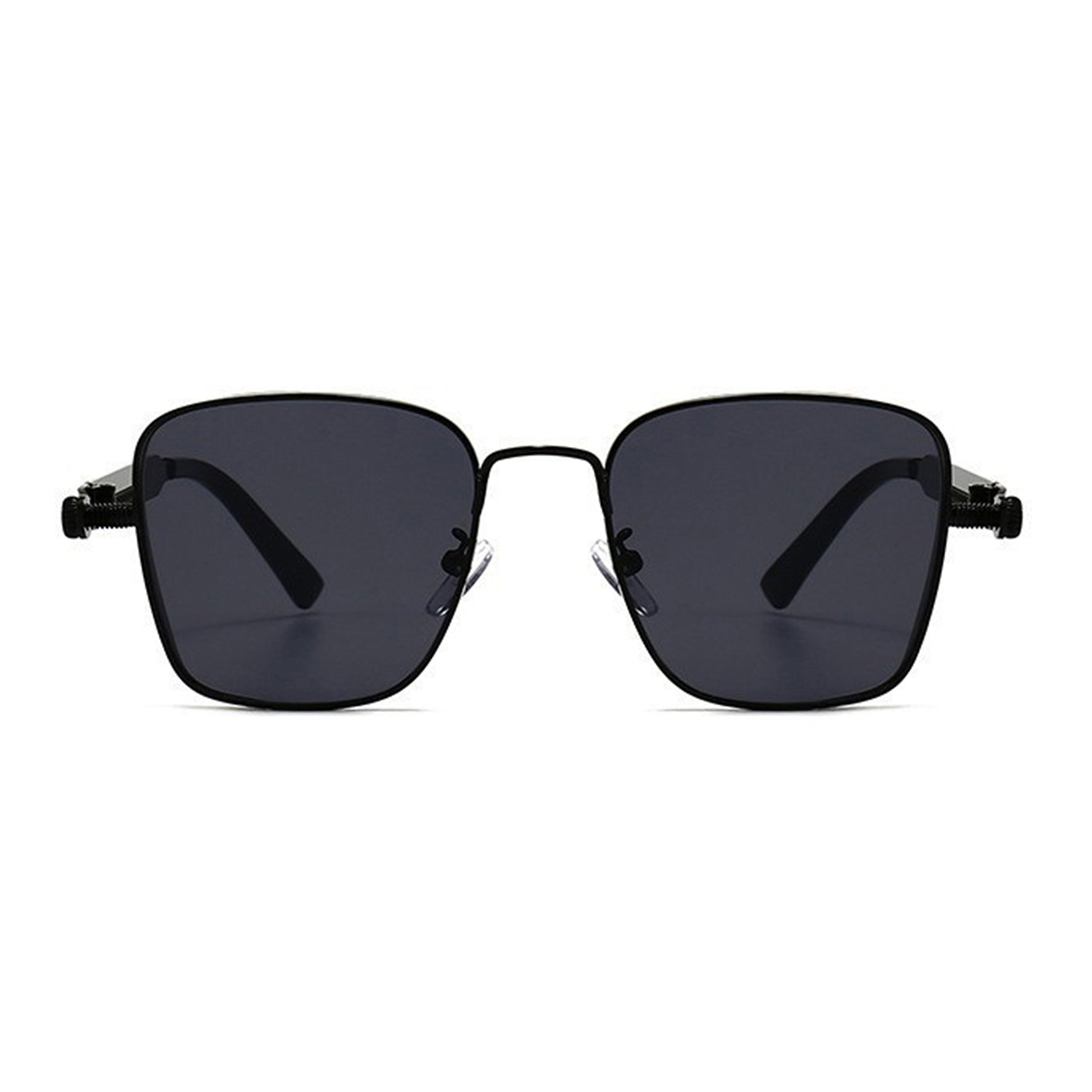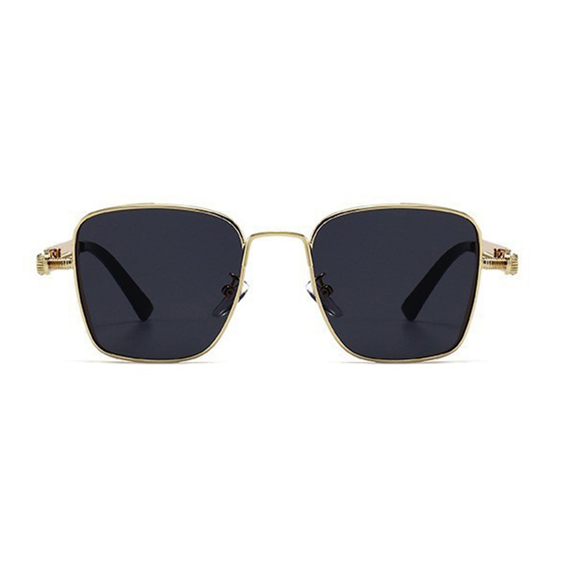 These unisex geometric square sunglasses blend edgy industrial design with modern elegance. Featuring a bold metal frame and sleek black lenses, they offer both fashion-forward appeal and UV400 protection. The unique side bar spring detailing adds character while enhancing durability. Perfect for those who want a strong statement piece with everyday wearability.