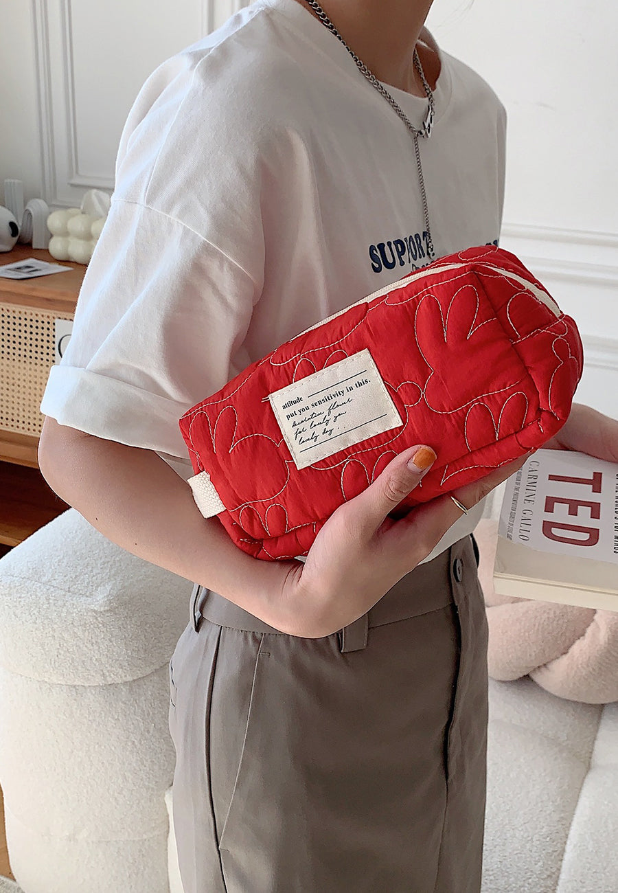 The pouch is detailed with fantastic contrast bunny stitches. Features a side handle and zipper closure.
