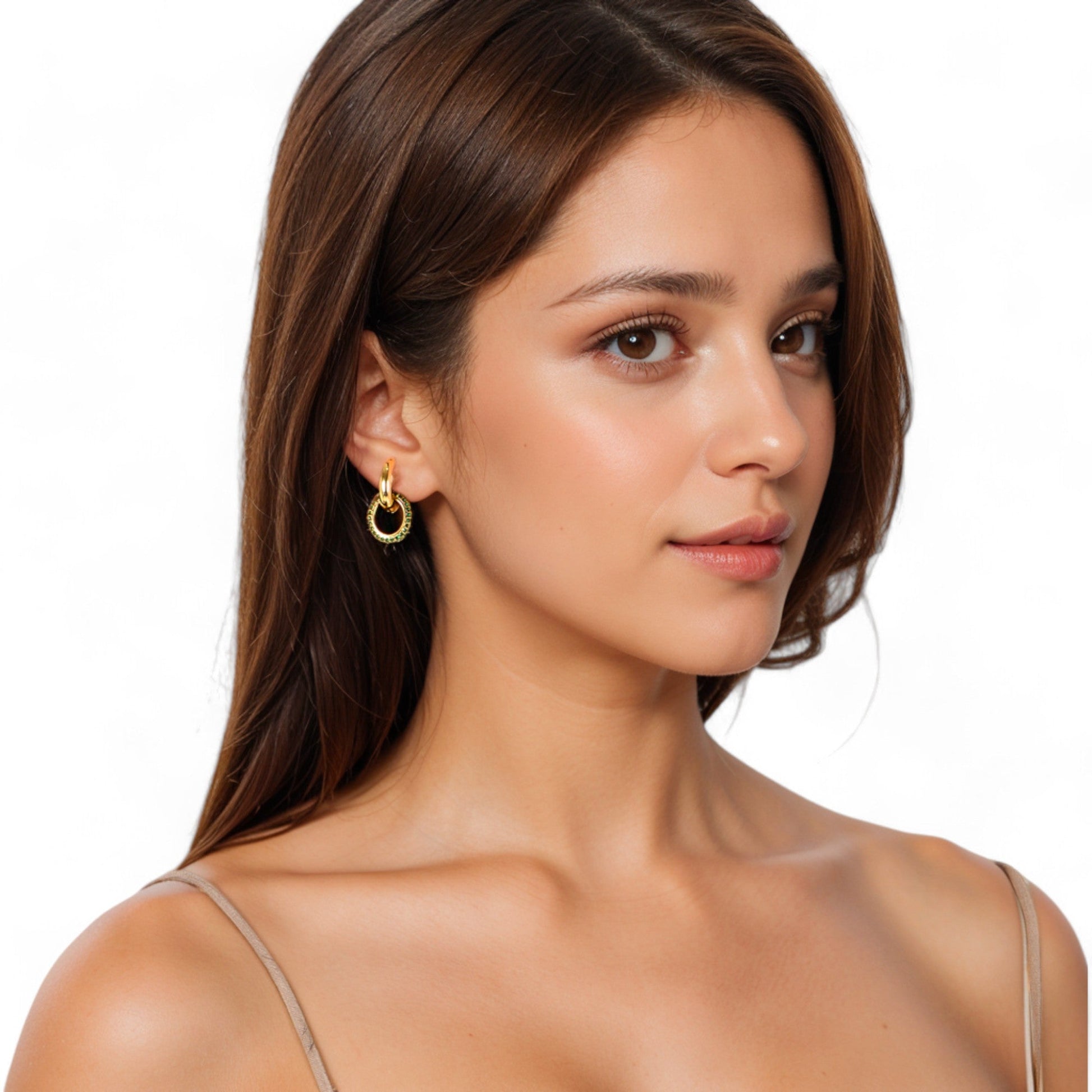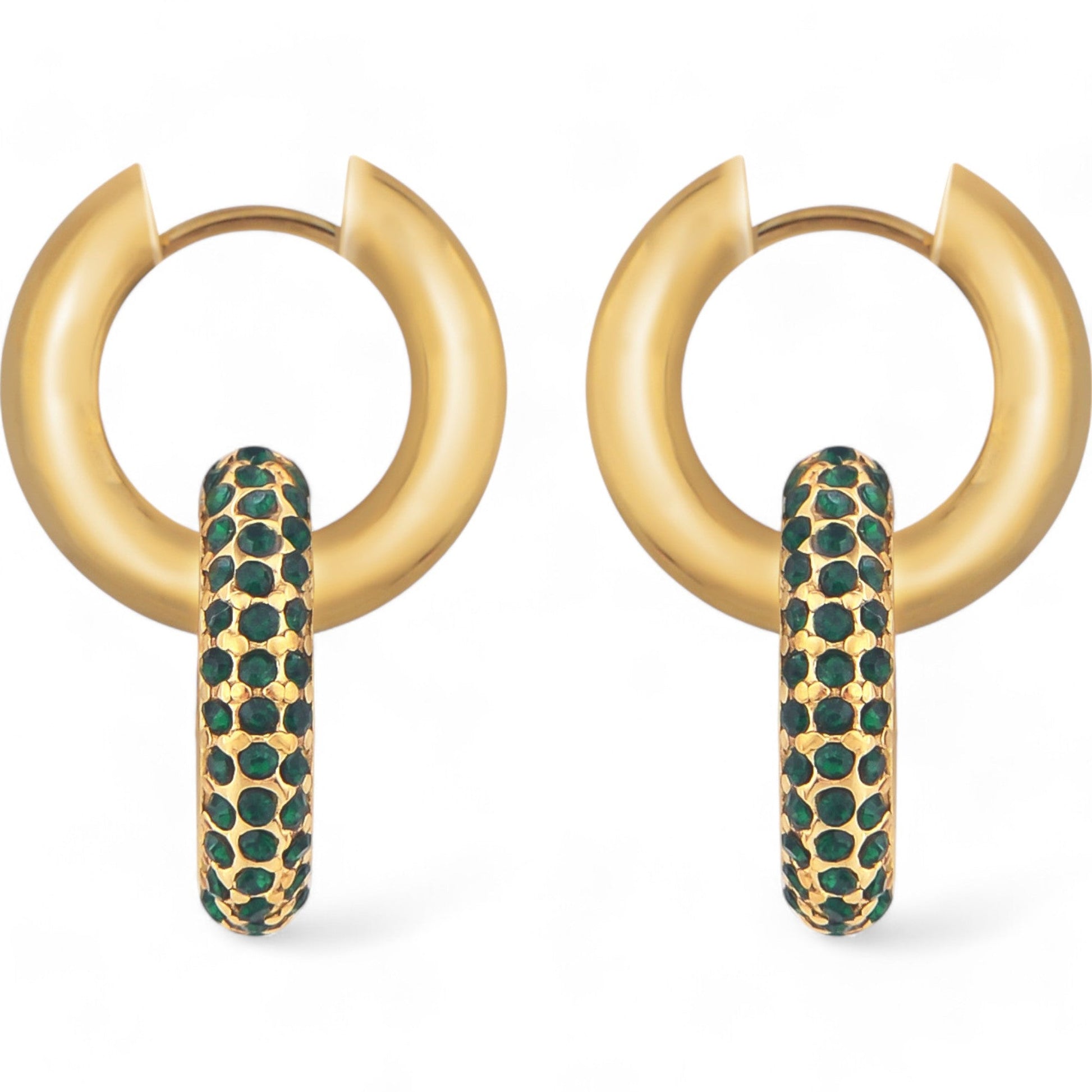 Gold Tone Hoop Earrings with Green Crystal Encrusted Accent Ring