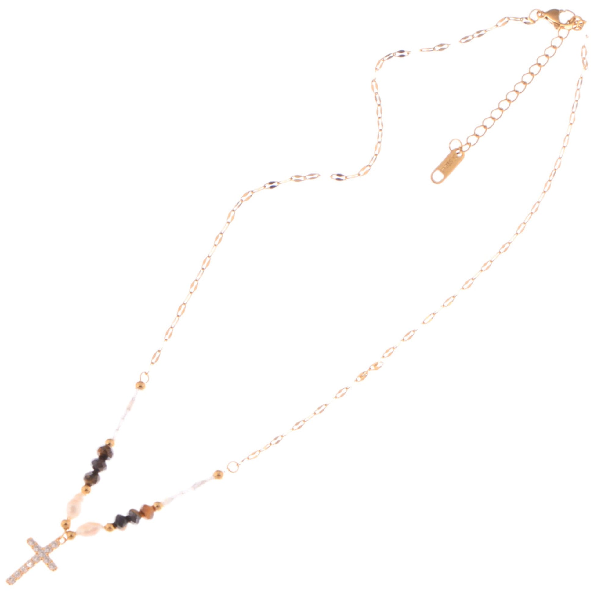 Beaded Cross Pendant Necklace with Faceted Stones and Gold Chain