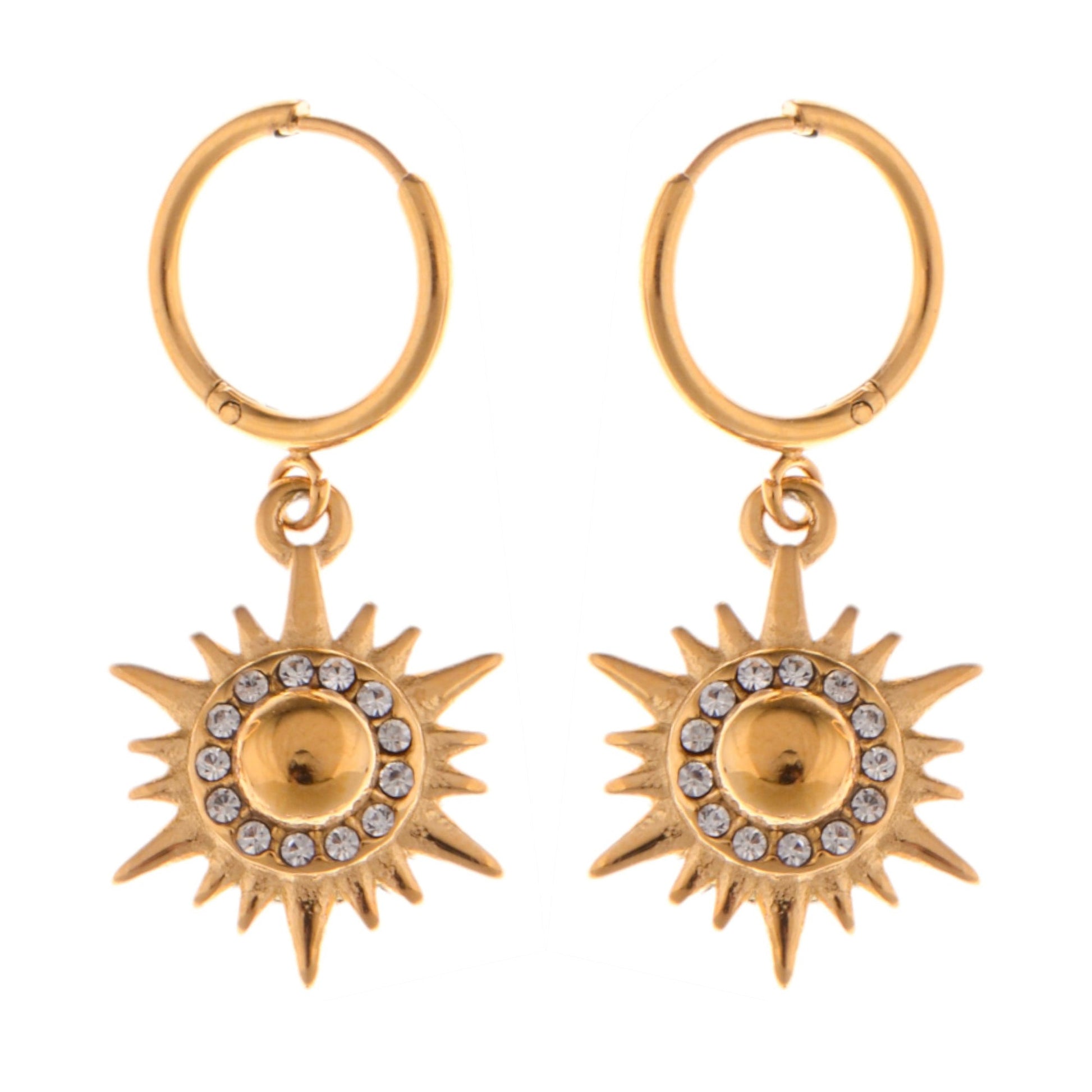 Add a radiant touch to your look with these Gold Tone Sunburst Dangle Earrings, featuring a bold starburst design adorned with sparkling rhinestone accents. The lightweight hoop and secure latch back ensure all-day comfort, making them perfect for any occasion. Whether dressing up a casual outfit or adding a celestial flair to a formal look, these earrings make a unique and eye-catching statement.