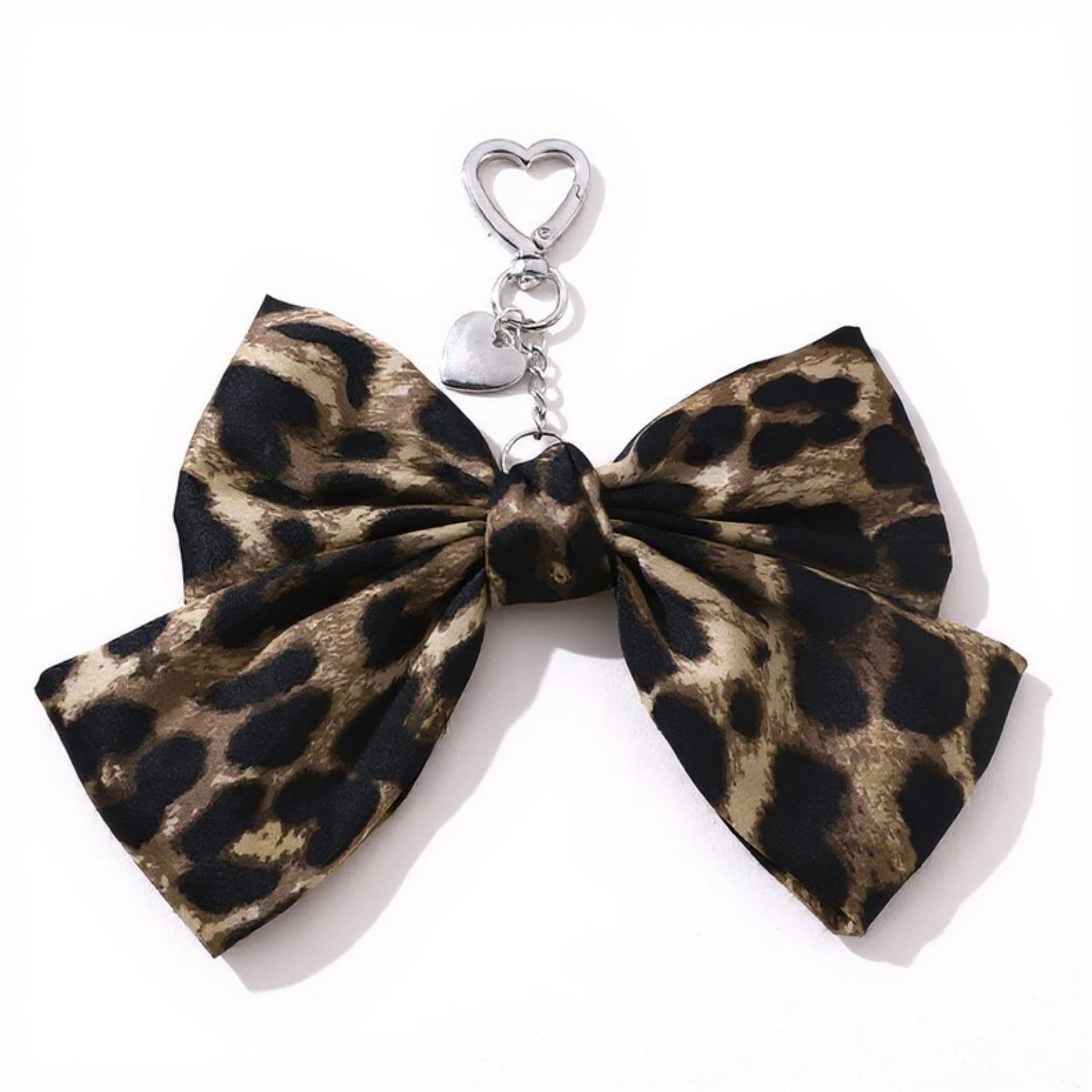 Leopard Print Fabric Bow Keychain with Silver Heart Clip Charm