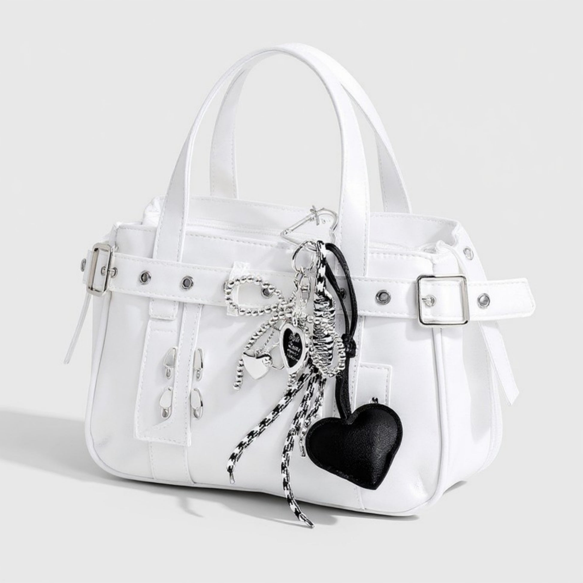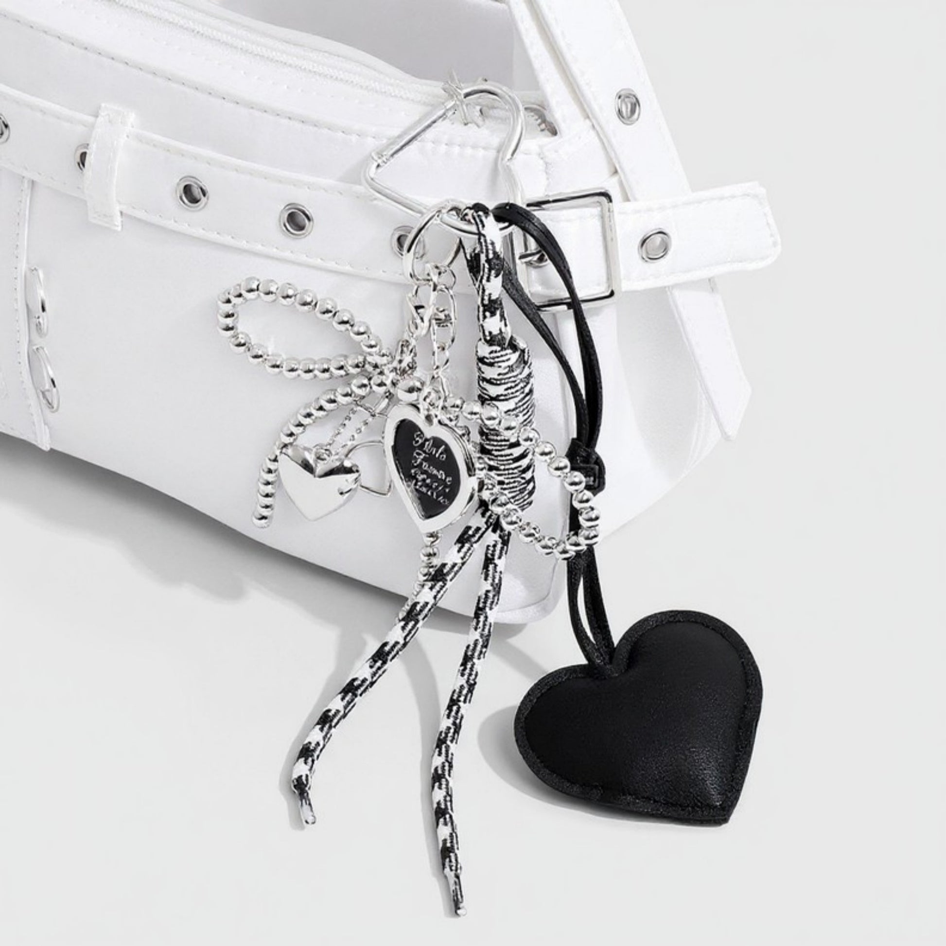 The Anna-Kaci Heart Charm Keychain blends edgy sophistication with romantic detail. Featuring layered heart charms in mixed materials, a soft heart pendant, and delicate silver-tone chains tied into a bow, this design exudes chic modernity. The heart-shaped clasp adds a playful touch while ensuring secure attachment to your bag, purse, or keys. With its stylish mix of textures and metallic shine, this keychain offers a perfect statement of elegance and individuality.
