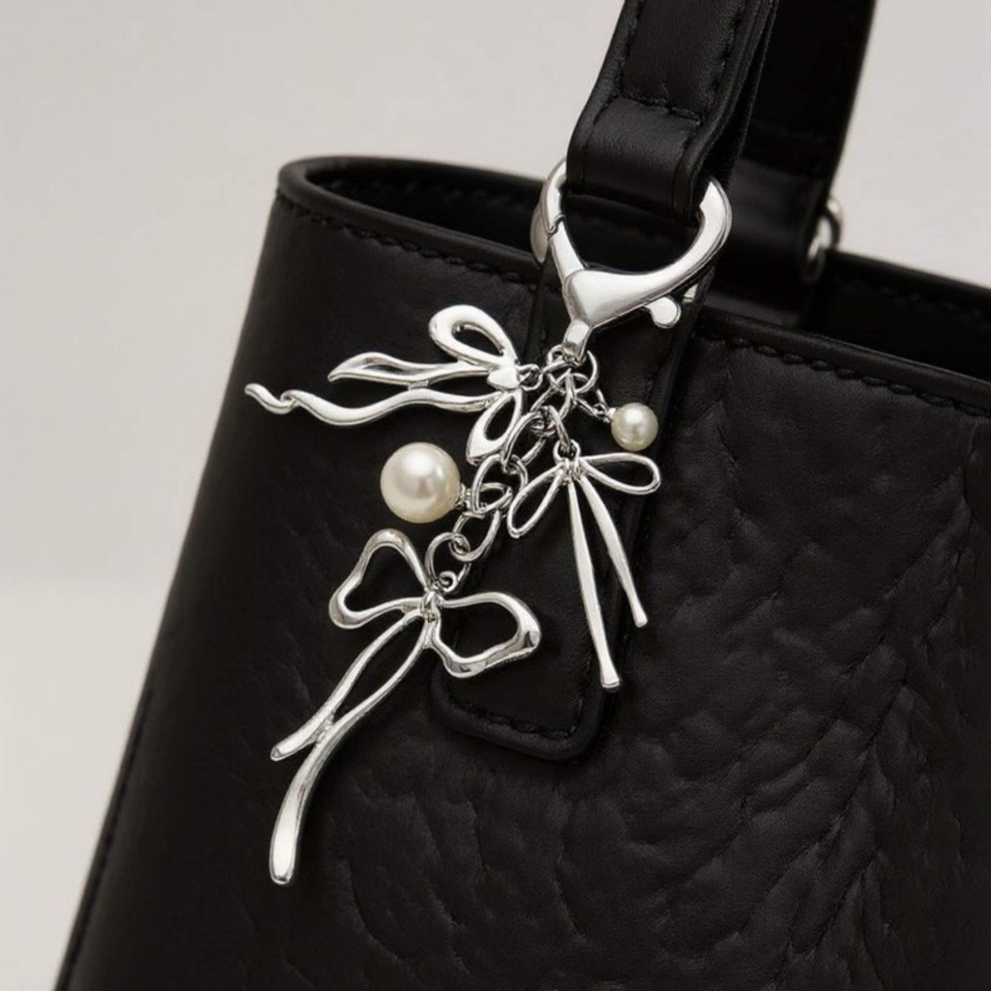 The Anna-Kaci Silver Bow Keychain exudes elegance with a modern, romantic twist. Crafted with delicate open-frame bow charms and accented by lustrous faux pearls, it combines sophistication and whimsy in one timeless design. The polished silver-tone finish catches the light beautifully, while the heart-shaped clasp adds a sweet feminine touch. Perfect for elevating your handbag, purse, or keys, this keychain makes a chic and graceful everyday accessory.