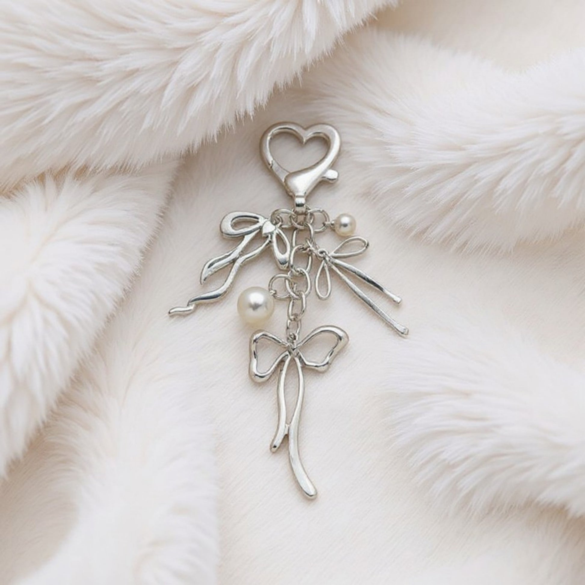 Silver Bow Keychain with Pearl Charms and Heart Clasp Accent
