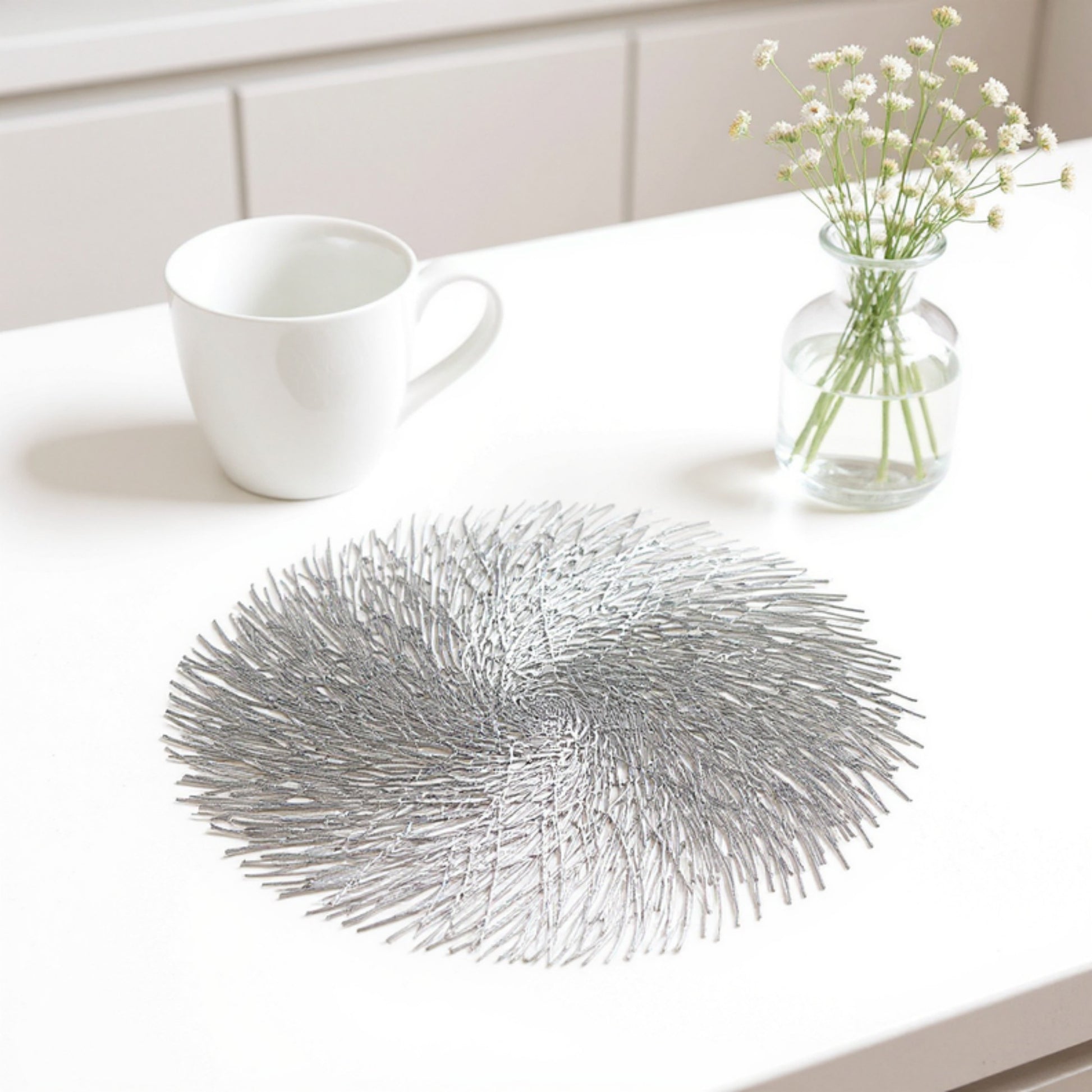 The Anna-Kaci 4-Piece Round Spiral Woven Placemat adds a modern artistic touch to your dining setup. Featuring a mesmerizing swirl pattern, this placemat blends elegant tones with a unique textural design for a refined and contemporary aesthetic. Crafted from durable, heat-resistant material, it protects your tabletop while enhancing your d¨¦cor with a sophisticated shimmer. Perfect for elevating dinner parties, festive gatherings, or everyday meals, this placemat brings style and function to every setting.