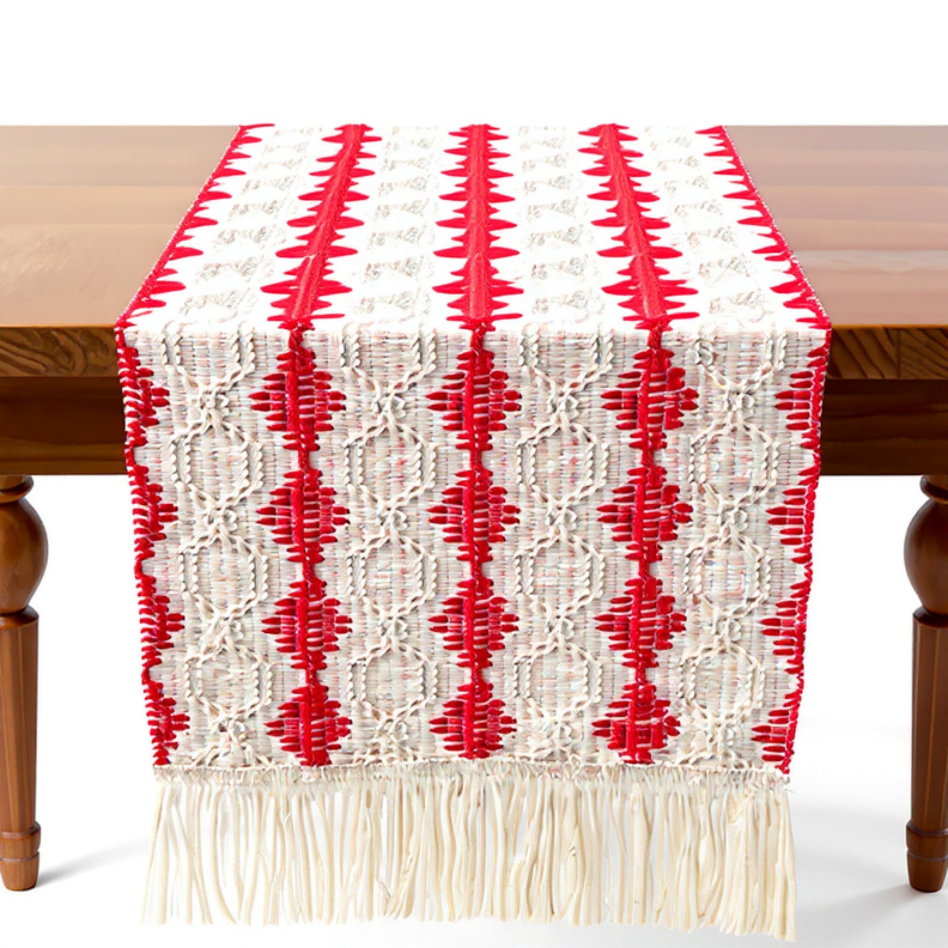 Woven Table Runner with Geometric Diamond Pattern and Fringe Ends