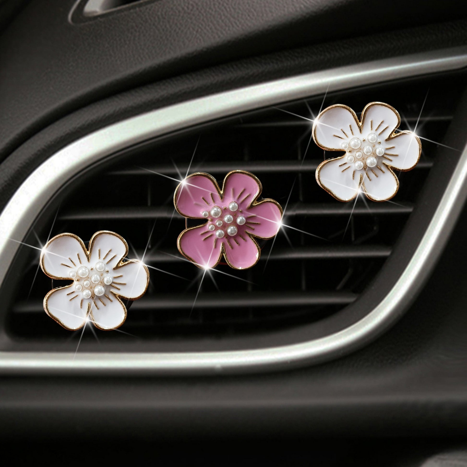 3-Piece Enamel Flower Car Air Vent Clip Set with Pearl Center Design 1.1in