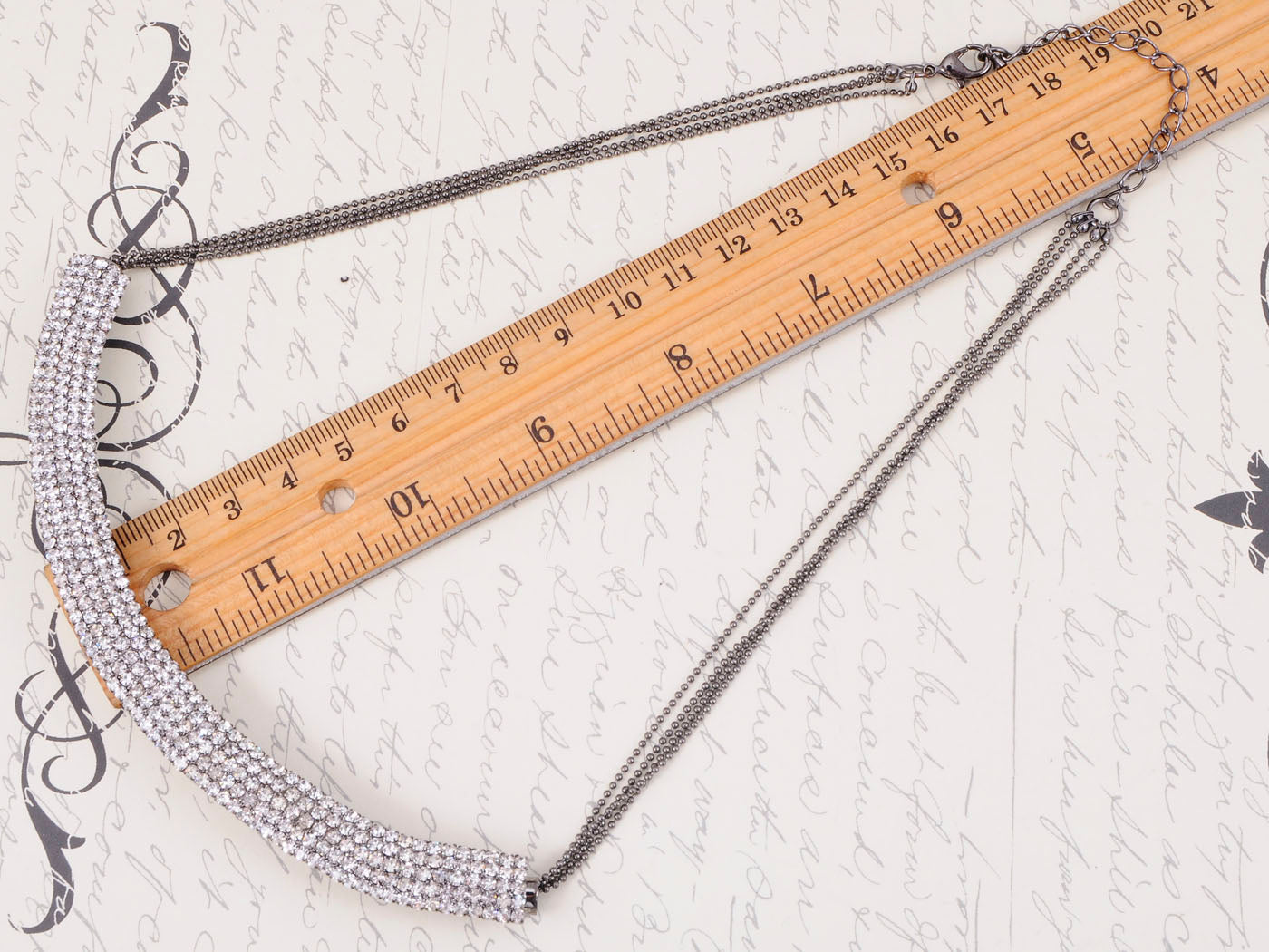 - CHUNKY RADIANT JEWELRY - Exquisitely encrusted with shimmering clear rhinestones this necklace is sure to make a statement on your neckline! Featuring a thick curved tube covered with faux diamond crystals and stylish gunmetal toned multi-layered ball chains.nes this necklace is sure to make a statement on your neckline! Featuring a thick curved tube covered with faux diamond crystals and stylish gunmetal toned multi-layered ball chains.