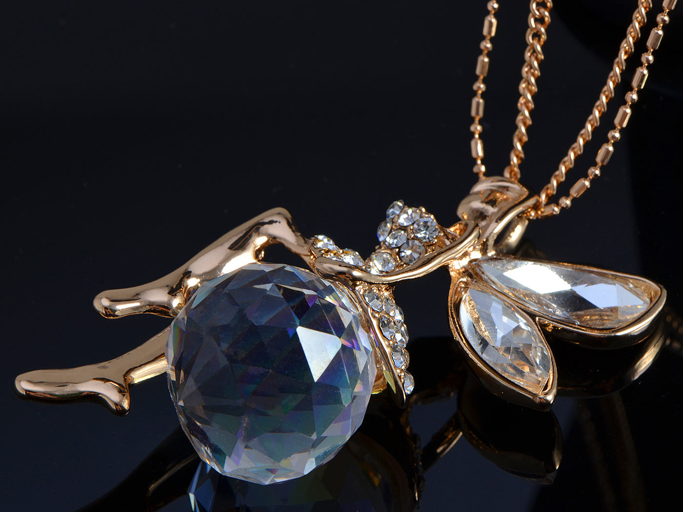 - SPARKLY AND LUXURIOUS CRYSTAL SHINE. Whether you're opting for something a bit more girly with our pink crystals or something a bit more mature as with the crystal orb or amber, almost rustic look, these pendants look fantastic and so sparkly, it's as if they were sprinkled with magical fairy dust. These flying pixies make for a great accessory because they keep that elegant high end jewelry look but combine it with a fun, unique, girly twist.