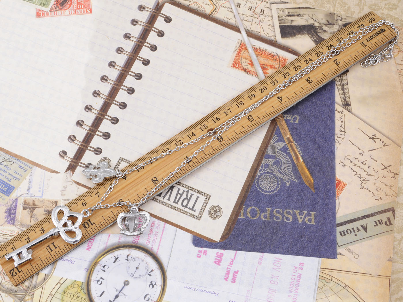 • Cute And Elegangt.This necklace has three pendant,a big key,a small crown and Fleur De Lis,they all in silvery and decorated with small clear faux rhinestones.
