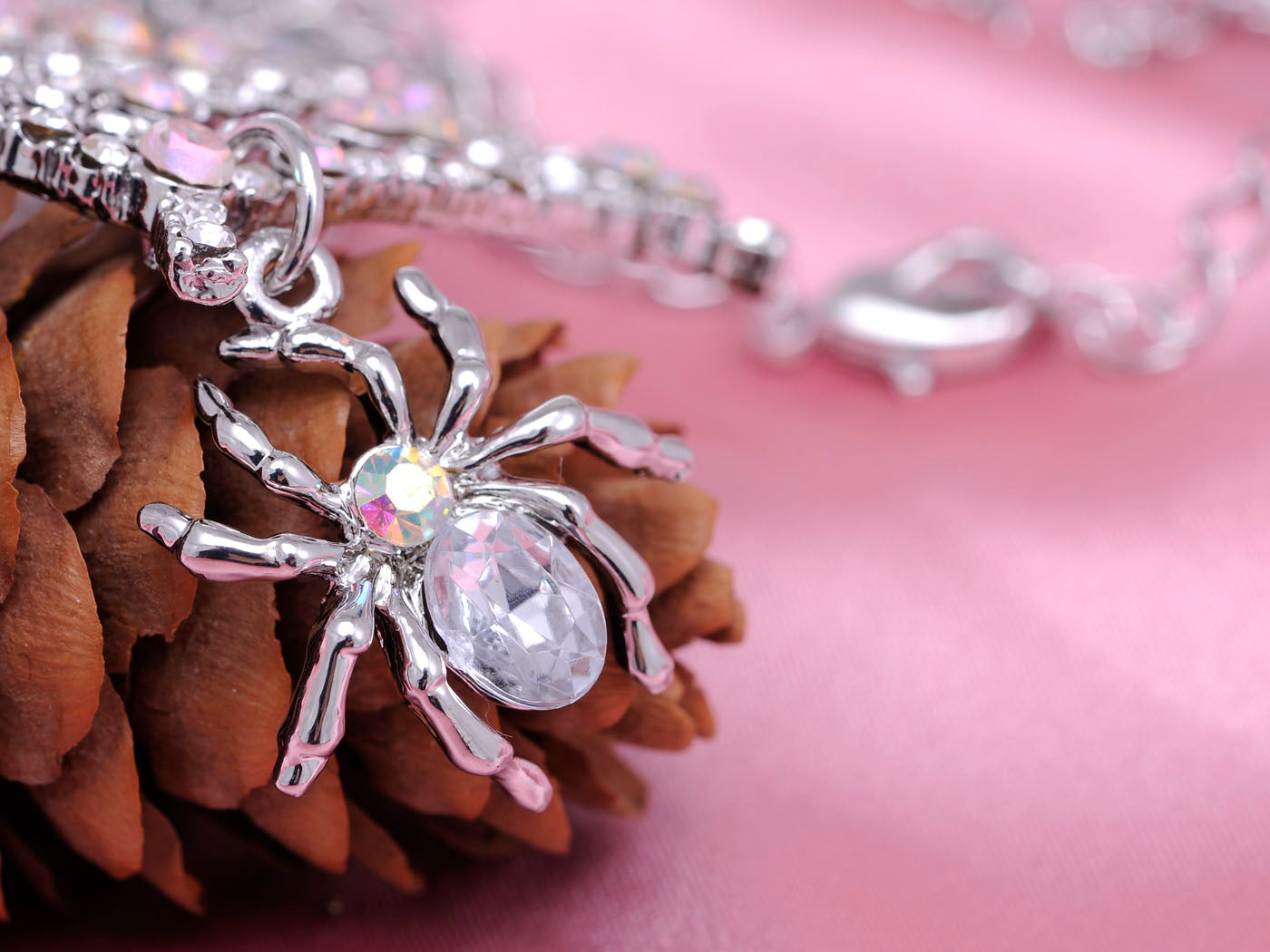 • UNIQUE DESIGN - Pendant necklace featuring dangle spider web design with iridescent clear crystal rhinestones and silver tone alloy metal.
