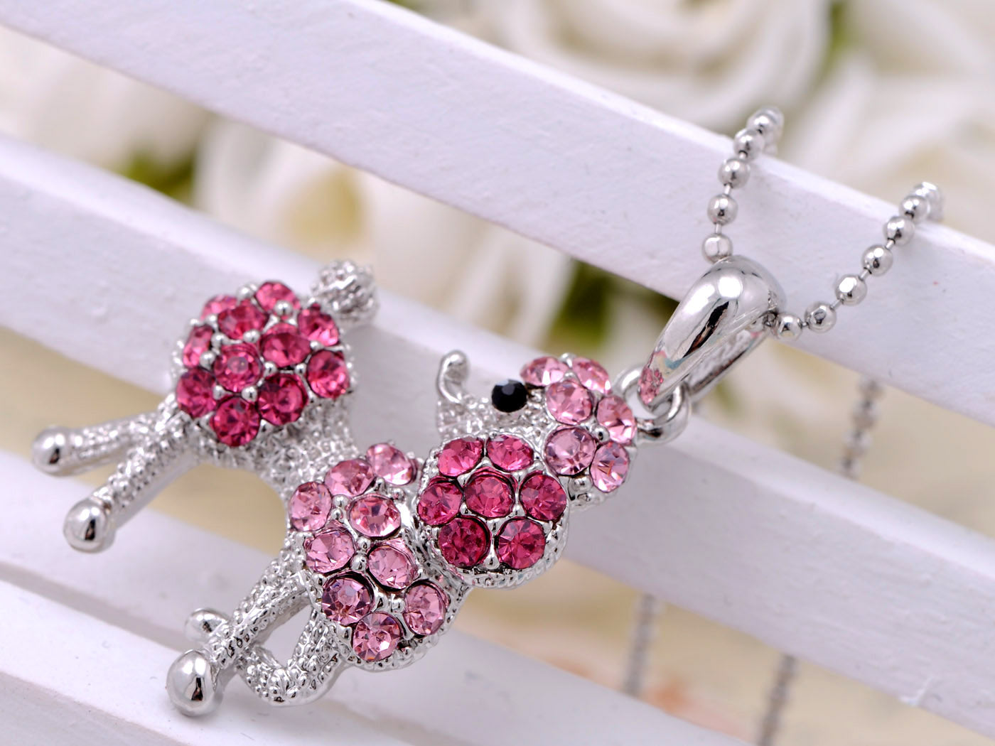 • UNIQUE DESIGN - Rope chain necklace featuring poodle charm with clear colored rhinestones and light peach colored gemstones.