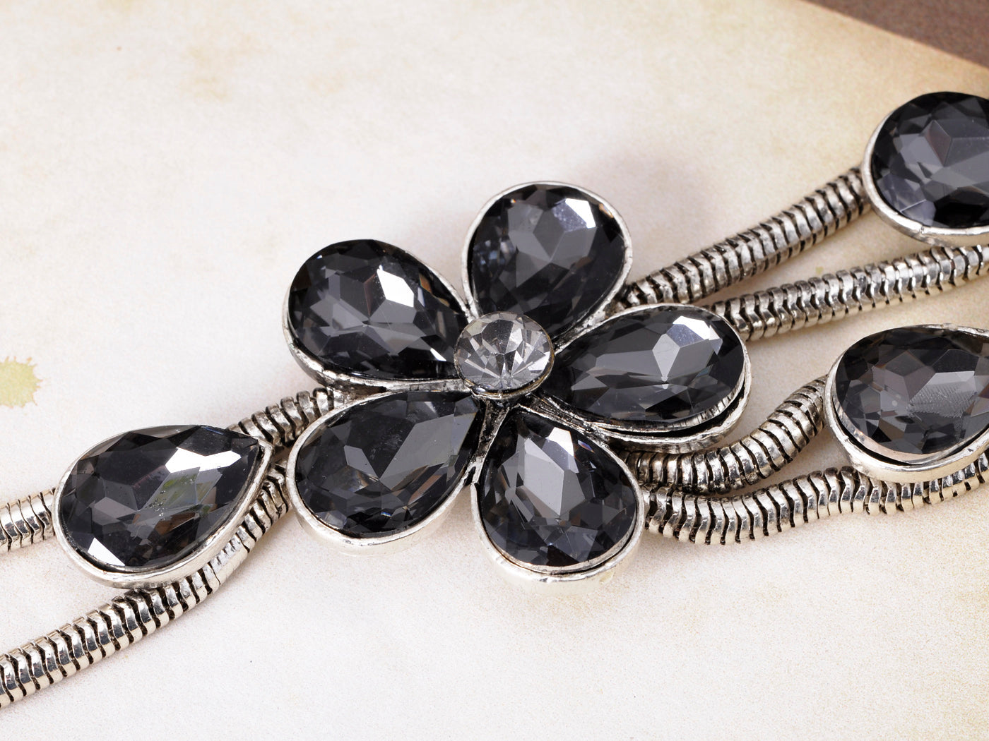 - ENCHANTING DESIGN - Unique and eclectic this brilliant statement necklace sparkles with elegant design of teardrop shaped rhinestones that dangle from a smoky grey crystal studded floral dairy centerpiece pendant. Round faux diamonds and the silver toned chain add the finishing touches.