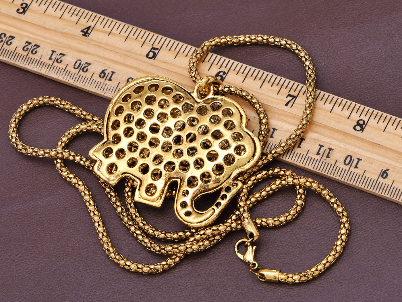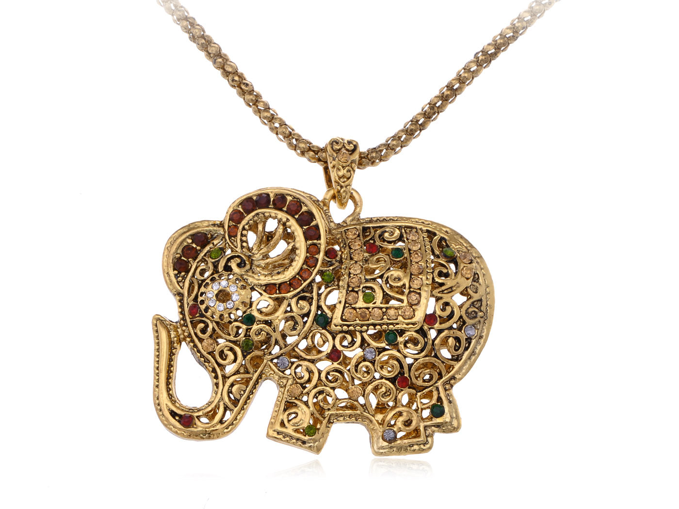 - HIGH QUALITY HANDICRAFT. This reproduction carved elephant pendant necklace was hand crafted to assure the highest quality possible . The whole body is made of golden alloy metal with colorful shinning rhinestone are dotted toemphasizethemystique.