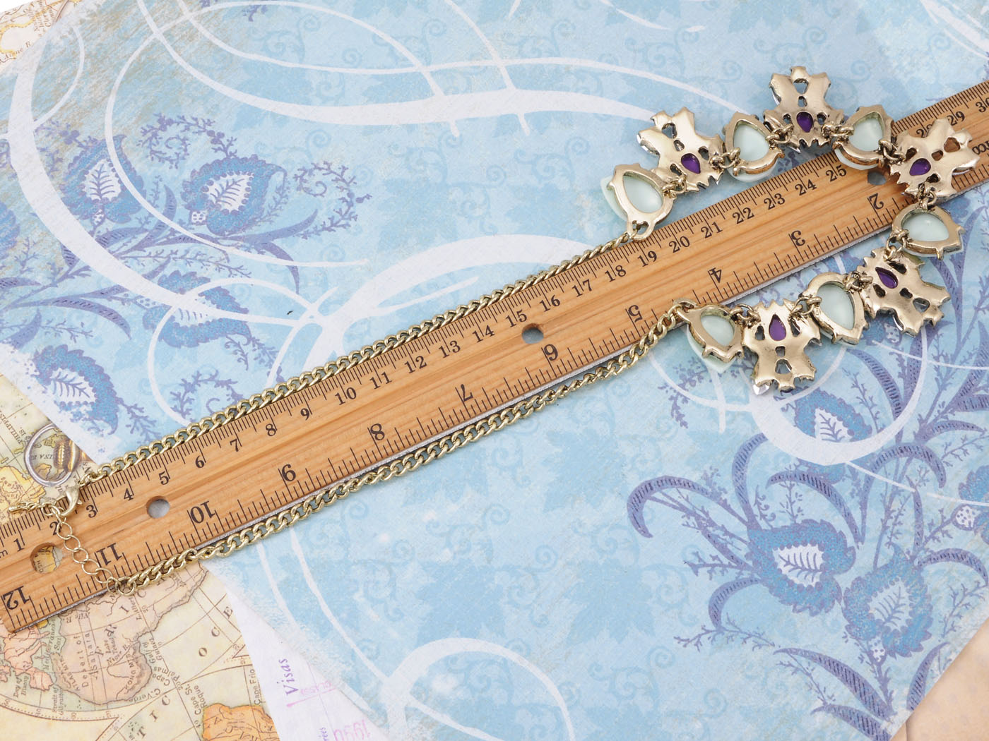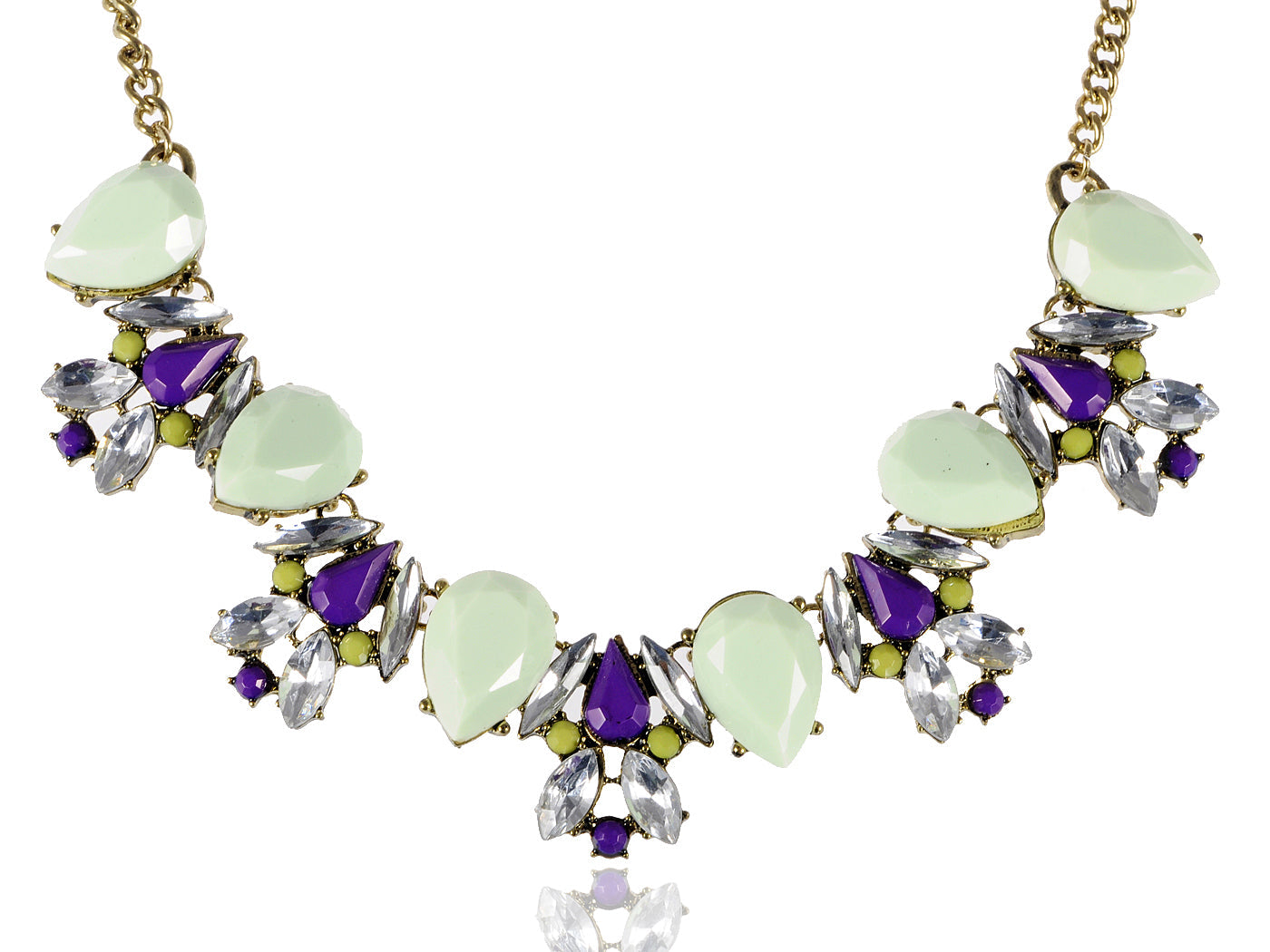 - LOVELY DESIGN - Beautiful golden tone necklace with a variety of geometric shapes encrusted with clear/ purple/ mint green colored crystal rhinestones. This necklace is such a stunning statement piece.