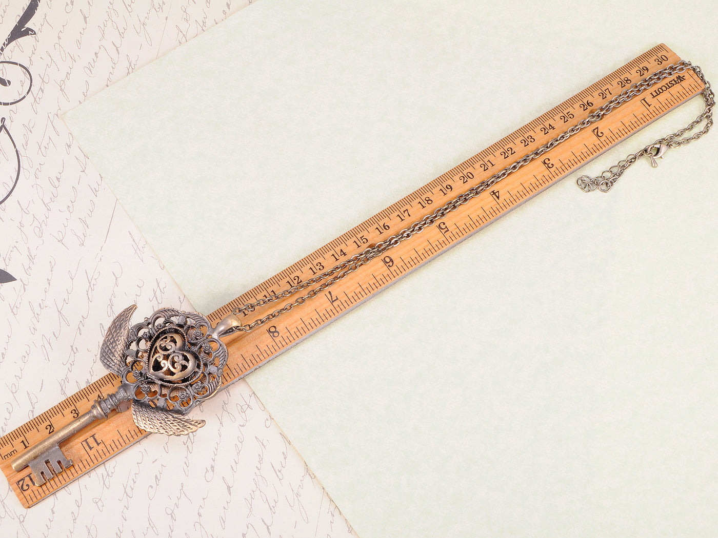 - BEAUTIFUL DESIGN - Lovely, unique golden tone key pendant necklace. They key has stunning details such as a flower on top with a heart inside and beautiful clear crystal rhinestones. The pendant also has a wing on each side for a unique feel.
