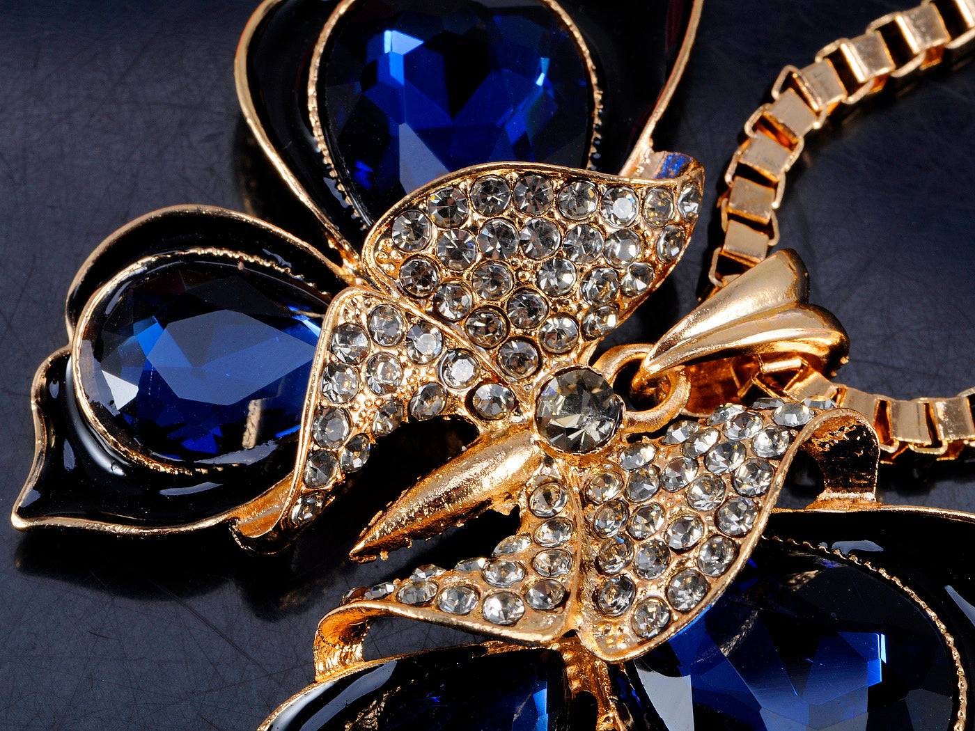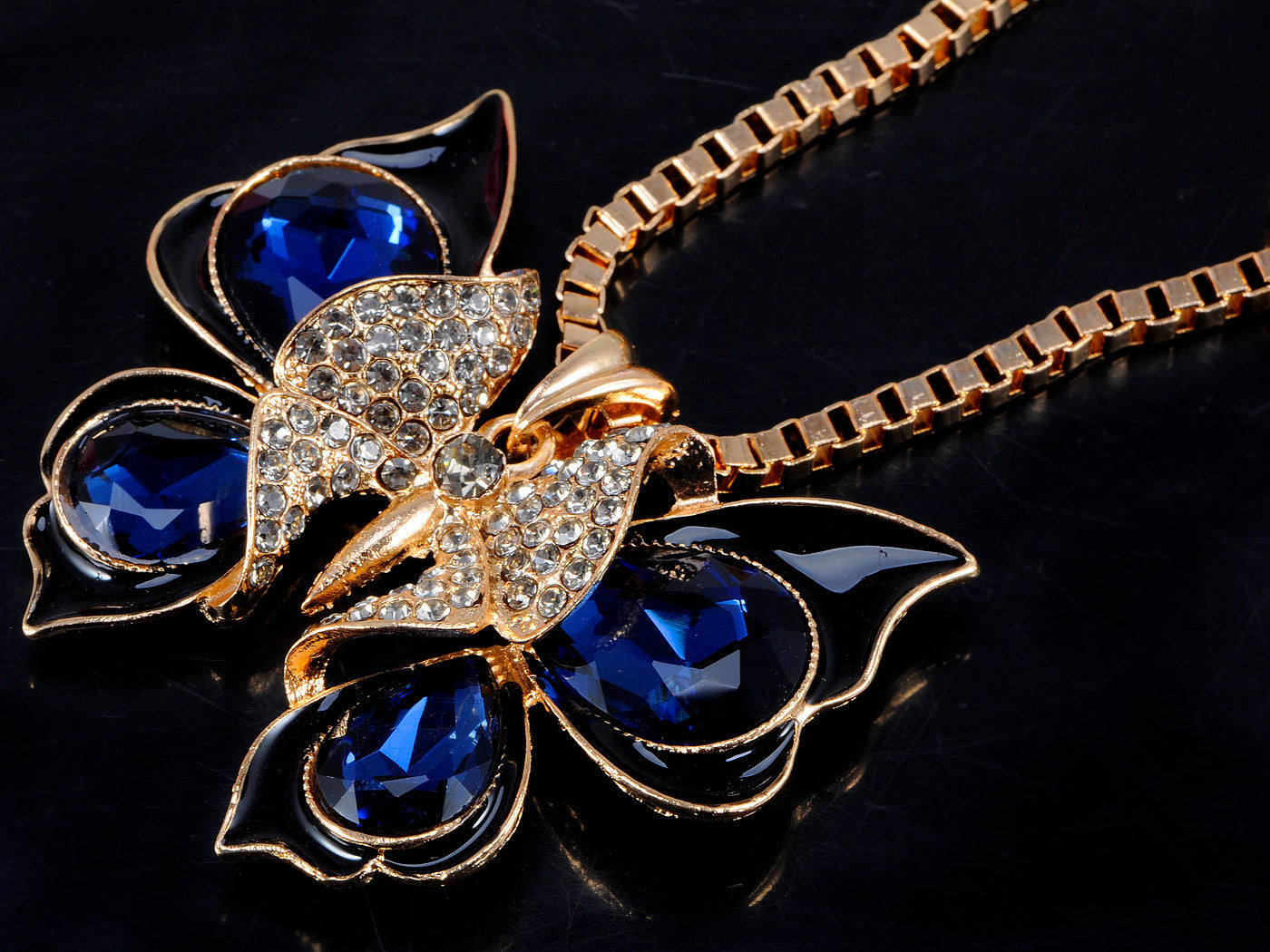 - UNIQUE DESIGN - This golden tone necklace featuring a butterfly pendant design with sparkly clear crystal rhinestones, large navy blue rhinestones on wings, painted black enamel on wings edge.