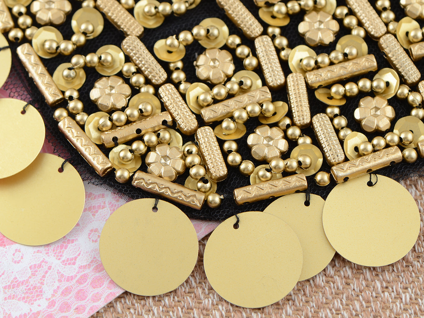 - STUNNING DESIGN - Lovely Egyptian like necklace that contains black fabric with golden tone sequins and beads woven throughout. Such a gorgeous statement necklace to own.