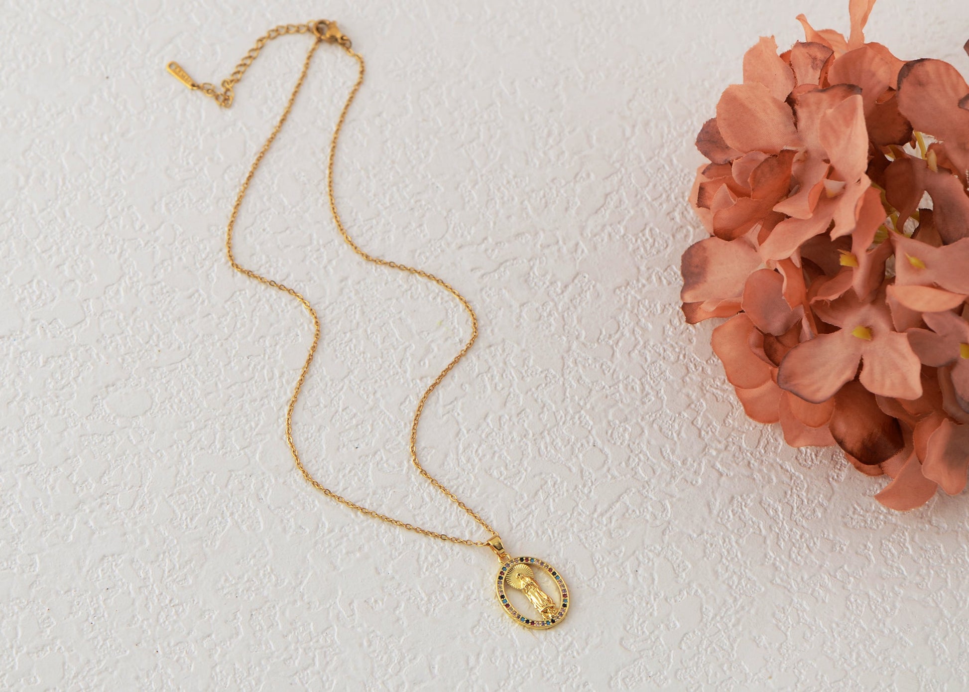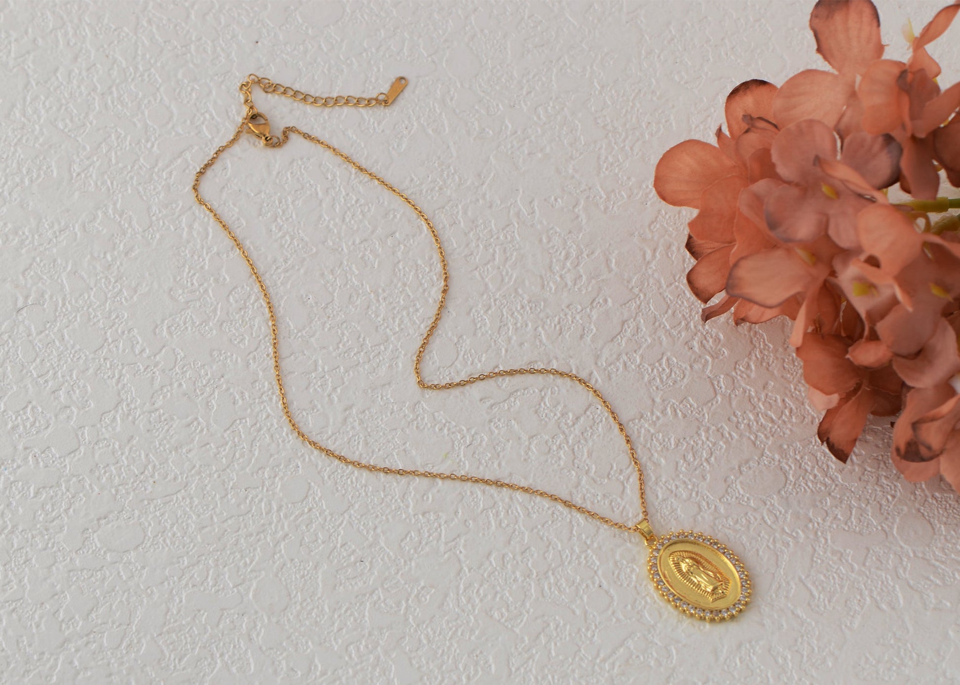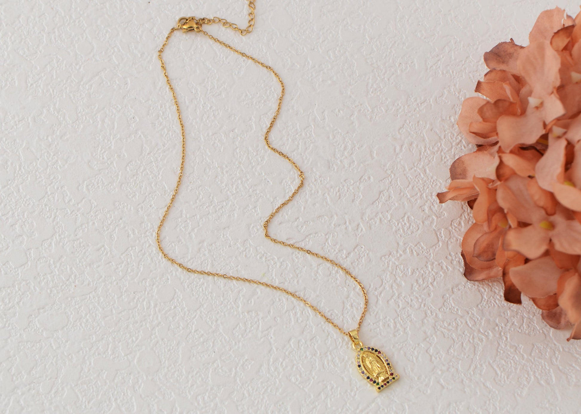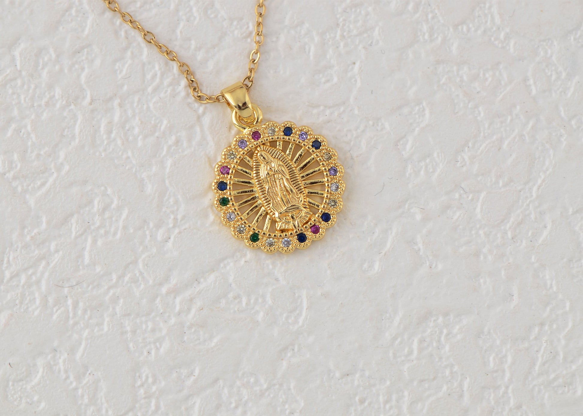 18K Gold Plated Crystal Rhinestone Virgin Mary Catholic Necklace - Our Lady of Guadalupe Medal Pendant - Christian Jewelry for Women and Men