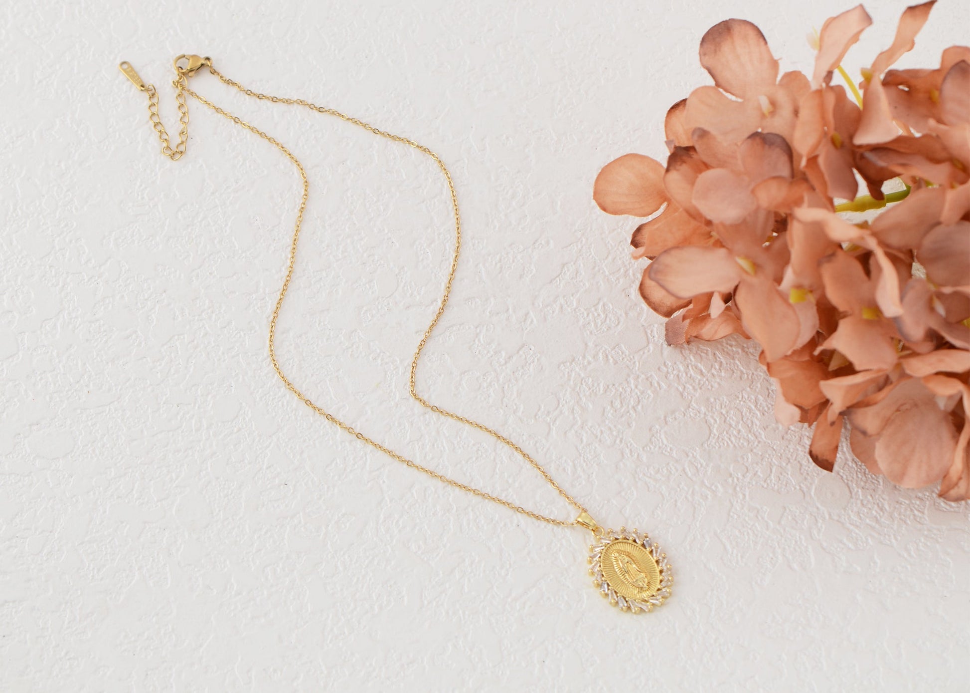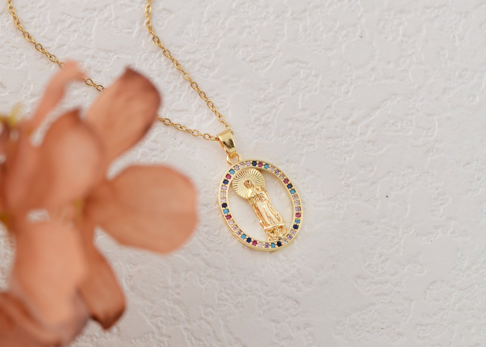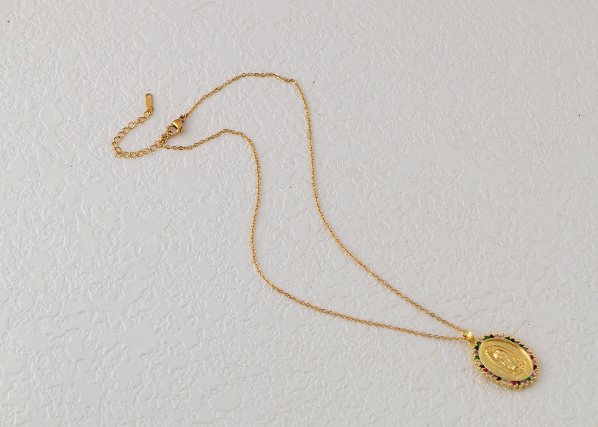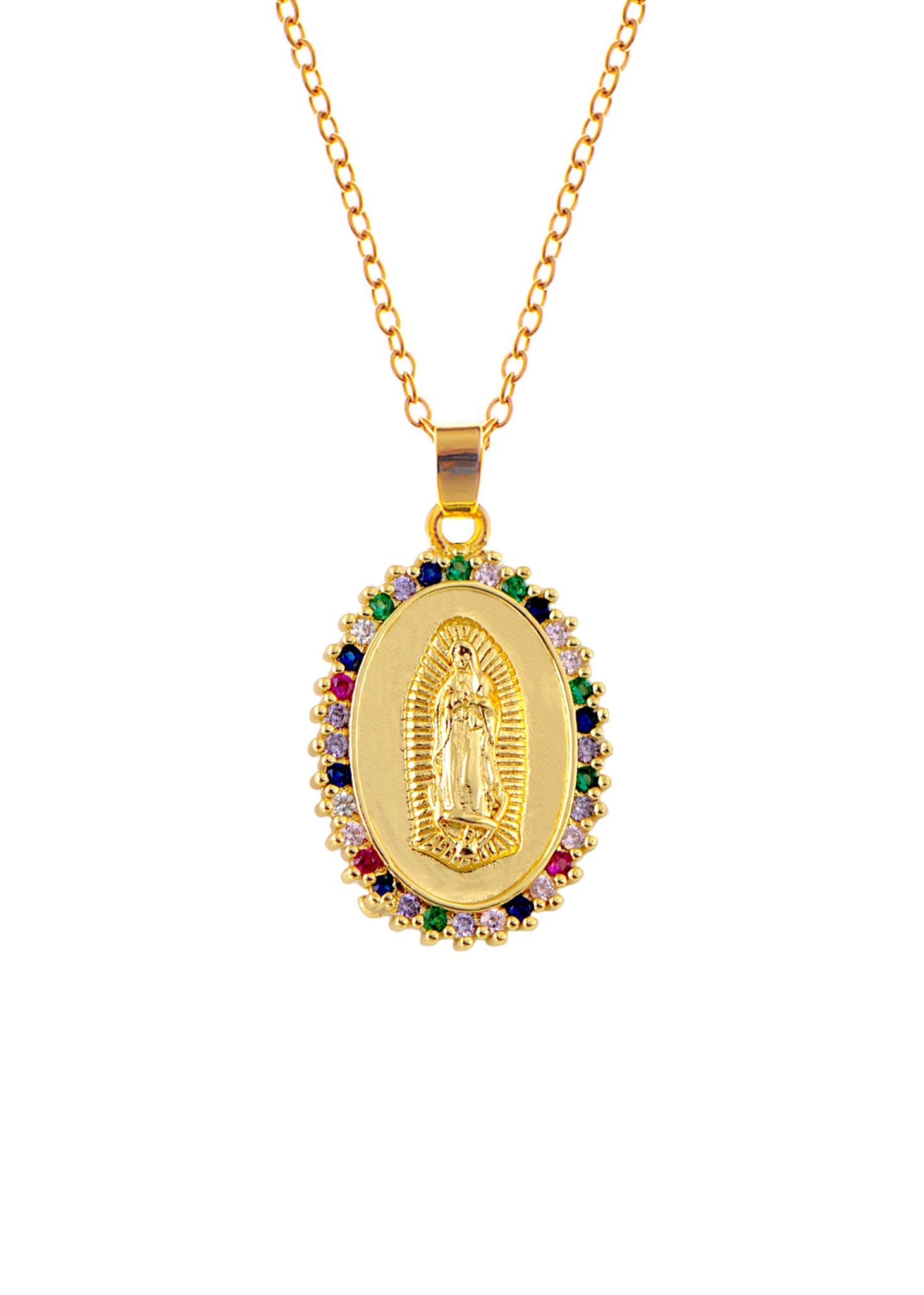 18K Gold Plated Crystal Rhinestone Virgin Mary Catholic Necklace - Our Lady of Guadalupe Medal Pendant - Christian Jewelry for Women and Men