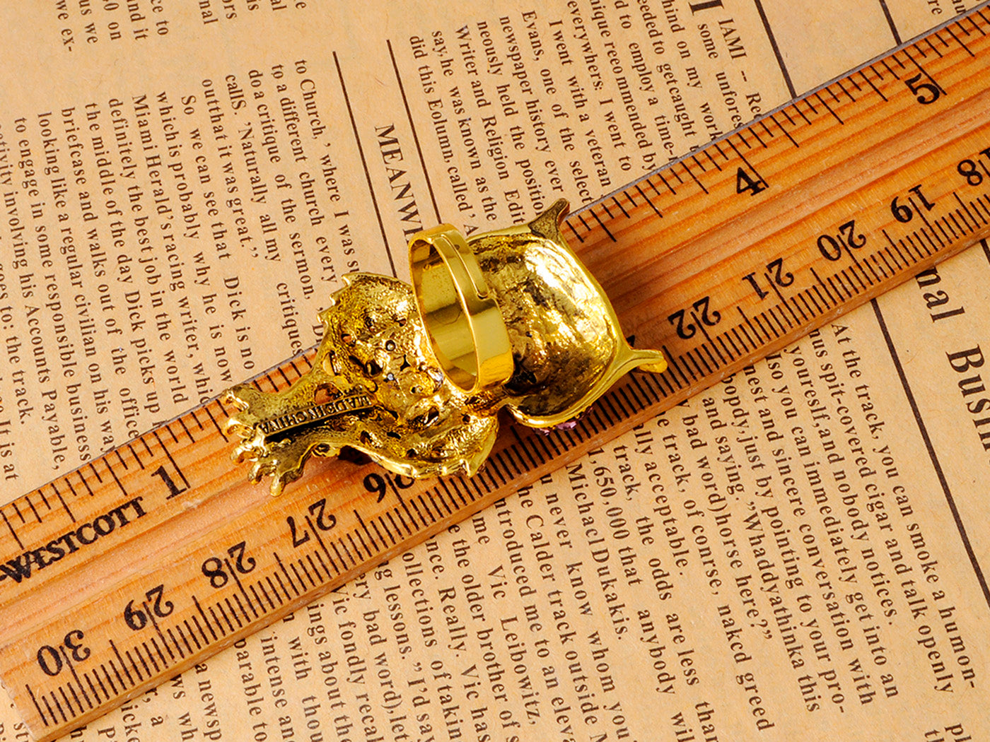 • This is a ring with attitude. Made from genuine rose and amethyst crystal rhinestones on a vintage dark golden tone polished metal alloy. The adjustable ring fits a wide range of ring sizes. Measure about 2 inches in height.